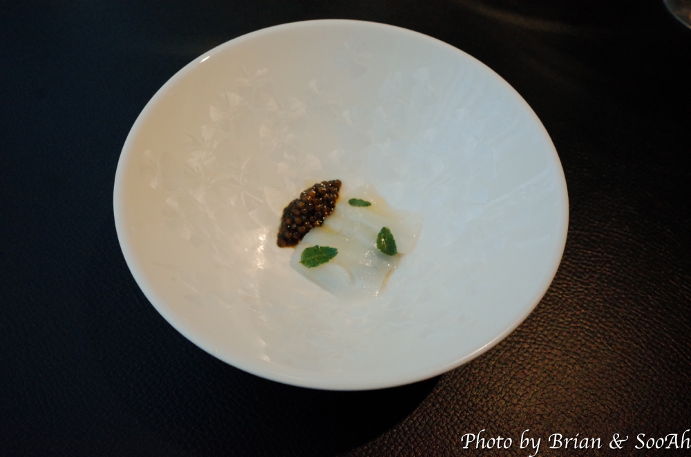 다음 음식은 칼루가 캐비어에 동해산 갑오징어를 슬라이스한 것에다가 아스파라거스 잎을 데코한 음식이었고, 제피 잎으로만든 살사 소스도 함께 서빙되었습니다. 해산물을 좋아하는 저로써는 식감이나 맛이 정말 맘에 드는 요리 중 하나였습니다.