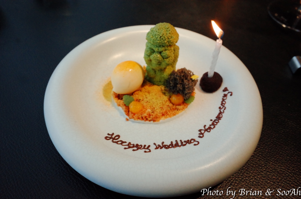 이 쯤 되어서 코스가 거의 끝나가서는... 제가 예약할 때 결혼기념일이라고 남겨서, 이렇게 하면 뭔가 축하해주시는 별도의 디저트/케이크가 나온다고 해서 기다렸는데... 나오질 않아서 별도로 얘기 드리니까 예약을 한 번 했다 취소하고 다시 하면서 결혼기념일이라는 정보를 남기지 않았더라구요. 그래서 어쩔 수 없지 하고 있는데, 잠시만 기다려 달라고 하더니 약 10분이 되지도 않아서는 아래와 같이 결혼 기념일 축하 디저트가 두 개의 플레이트가 나오더군요. 이렇게 빨리 대응해서 새로이 나오는 거에 감동~~!