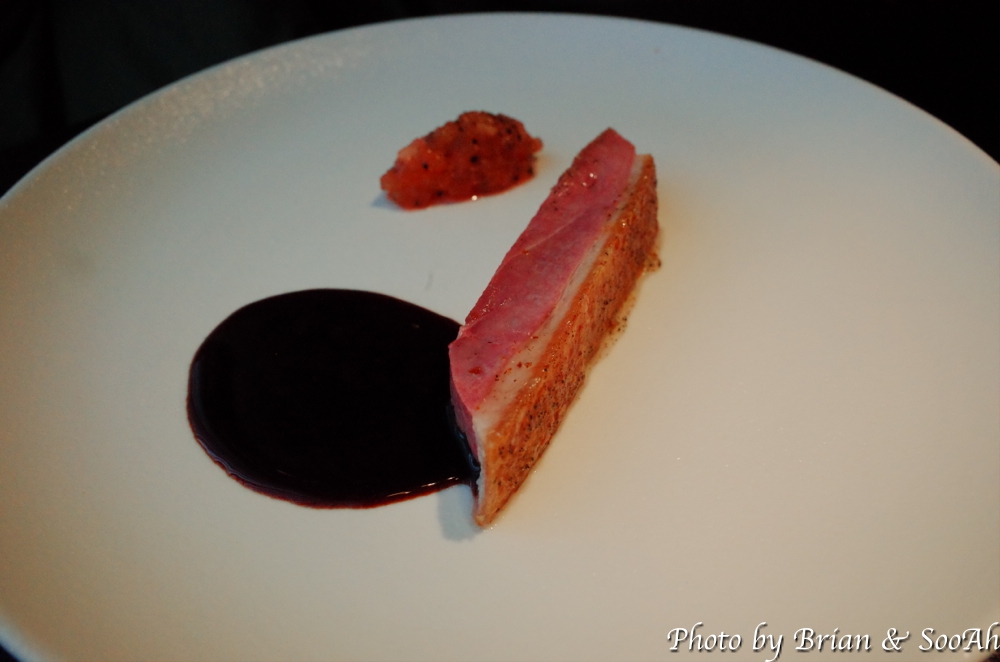 메인 요리는 소고기의 경우에는 투뿔 한우 안심이었다고 하셨고, 그 아래 소스는 소뼈를 오랜 시간 우려낸 걸 베이스로 한 소스라고 안내 받았습니다. 오리 요리의 경우에는 오리 가슴살을 냉장고 한 켠에 말려 바삭하게 껍질을 만든 후, 전분 가루를 살짝 묻혀서 구운 요리이며, 그 옆의 빨간 건 살사 소스로 제주산 홍다래, 레드키위, 사과로 만든 소스이고 라벤더 시럽으로 향을 더했다고 하네요. 그리고 오리 아래의 소스는 덕주 소스로 오리 뼈를 오랜 시간 고아내서 복분자주와 함께 쫄여 만든 소스라고 하더라구요. 제가 조류는 잘 못 먹어서 오리 고기는 못 먹었지만, 한우 안심이랑 봄나물은 맛있게 먹었습니다.