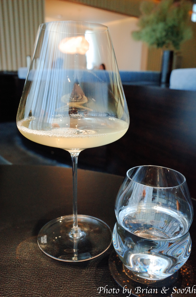 점심 코스로 일단 주문을 하였고, 여기에 식사와 함께 하는 술을 시킬 수 있는데, 잔 수로 주문이 되어서, 인당 2잔으로 해서 추천 와인을 마시는 것으로 하고 주문을 했더니, 조금 있다가 전반부에 코스 요리와 함께 마시는 화이트 와인을 가지고 오셔서는 와인에 대한 설명을 해주시고는 잔을 채워주셨습니다. 개인 취향에 맞춰서 마나느님과 제가 다른 와인을 마셨는데, 마나느님은 Granbazan Albarino Etiqueta Ambar라는 와인을 1잔 마셨고... 왜 제 꺼는 사진을 안 찍어서 기억을 못할까요....T.T