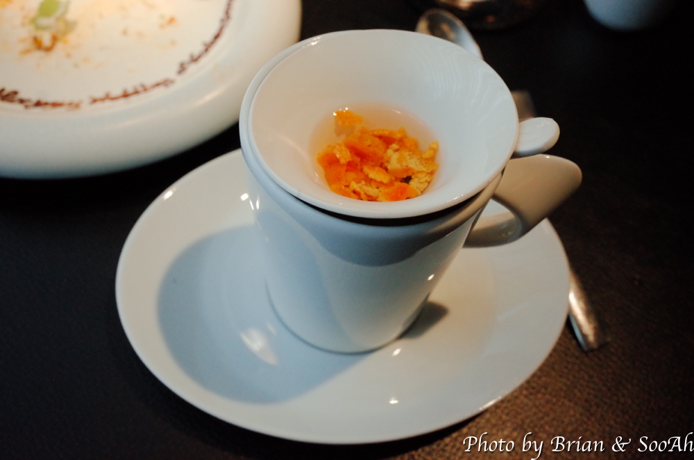이렇게 메인이 끝나고 나서는 프리디저트라고 해서 입가심하게 먹을 수 있도록 했다고 했는데요, 술찌게미를 보통은 술빵 같은 걸 만드는데 이걸 팔팔 끓여서는 고소한 풍미를 가진 소르베처럼 만들고, 그 아래에는 제주산 블러드 오렌지를 베이스로 한 소르베가 있었습니다.
