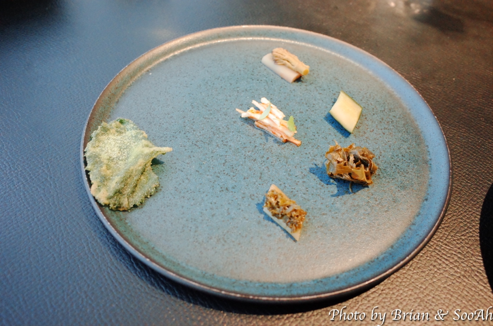 그러고는 바로 첫 Plate가 나왔습니다. 아래 개별 사진에 더 근접사진을 찍긴했는데, 가장 왼쪽부터 시계방향으로 얘기하면 첫번째는 두부와 명란 위에 감태를 바르고 들기름에 담은 플레이트였고, 그 다음은 관자타르트 위에 가쯔오부시 가루를 뿌린 요리였고, 다음은 빵 위에 트러플소스와 파마산치즈를 뿌린 전채요리였습니다. 그리고 배와 생강 레몬그라스로 만든 배 수프와, 가운데 가장 큰 플레이트에는 낙지와 드라이토마토에 먹물 소스를 함께 한 플레이트였습니다. 보기도 좋고 각각 식감이나 먹기도 좋아서 맛있게 먹었습니다.