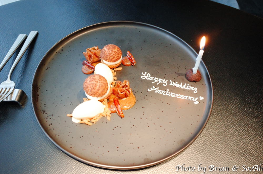 이 쯤 되어서 코스가 거의 끝나가서는... 제가 예약할 때 결혼기념일이라고 남겨서, 이렇게 하면 뭔가 축하해주시는 별도의 디저트/케이크가 나온다고 해서 기다렸는데... 나오질 않아서 별도로 얘기 드리니까 예약을 한 번 했다 취소하고 다시 하면서 결혼기념일이라는 정보를 남기지 않았더라구요. 그래서 어쩔 수 없지 하고 있는데, 잠시만 기다려 달라고 하더니 약 10분이 되지도 않아서는 아래와 같이 결혼 기념일 축하 디저트가 두 개의 플레이트가 나오더군요. 이렇게 빨리 대응해서 새로이 나오는 거에 감동~~!