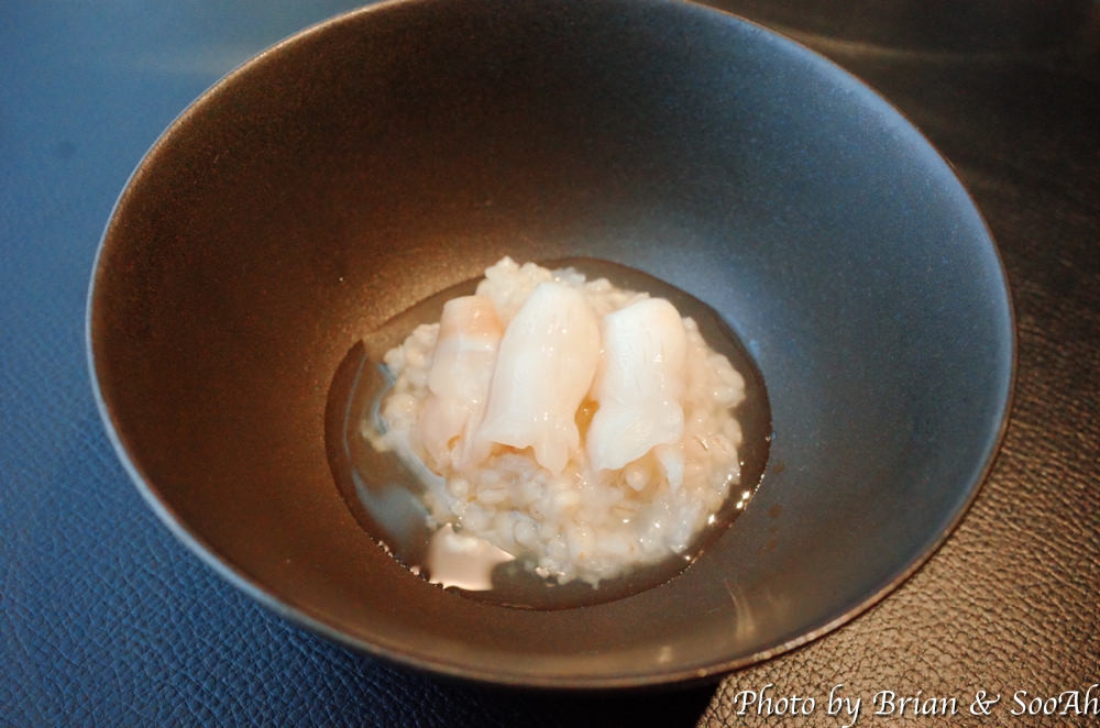 그 다음은 왕우럭조개죽이었습니다. 주먹만한 왕우럭조개를 저며서 잘게 준비해서 먹기 좋은 사이즈로 서빙되었구요, 이 조개로 만든 육수에 된장을 풀어서 죽 베이스를 만들어서 쌀과 보리를 같이 끓여서 식감을 좋게 했다고 했는데 정말 죽인데 식감이 좋은 것도 신기했습니다. 그리고 육수를 조금 더 따로 부어주시던데, 그 때 향이 정말 좋더군요.