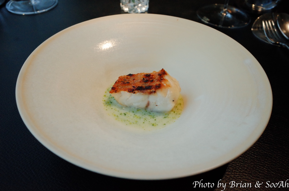 그 다음 플레이트는 능성어로 주 재료로 한 요리였는데요, 능성어를 숯불에 구어서 껍질이 바삭하게 만들고, 그 아래에는 구운 애호박과 슬라이스한 마와 감자 수제비를 더했다고 하더군요. 그리고 아래 부어진 소스는 능성어 뼈에 훈연향을 입힌 후 맑게 뽑아낸 육수에 크림과 버터를 더해서 만든 소스이고, 거기 위에 있는 초록색 오일은 쑥갓과 깻잎으로 만든 아로마 오일이라고 하더군요. 능성어의 껍질 식감이 너무 바삭하고... 이것 역시 너무 맛있었습니다.