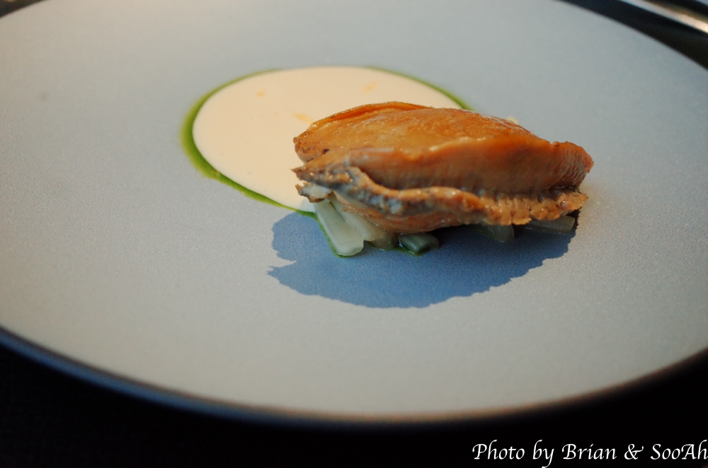 그 다음은 완도산 전복을 1시간 찐 다음에 훈연한 것을 Smoked 김치 위에 얹어서 내놓고, 그 옆에 화이트와인 베이스로 한 뵈르블랑 소스(노란색 소스)에 부추 오일을 둘러서는 내놓은 플레이트였습니다. 전복이란 식재료도 참 고급이지만, 이렇게 찌고 훈연하고, 참 손이 많이 가게 내놓으니 그만큼 풍미가 더해져서 좋더군요.