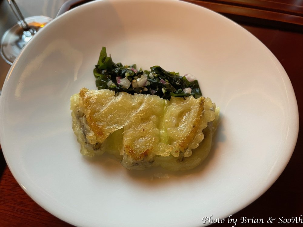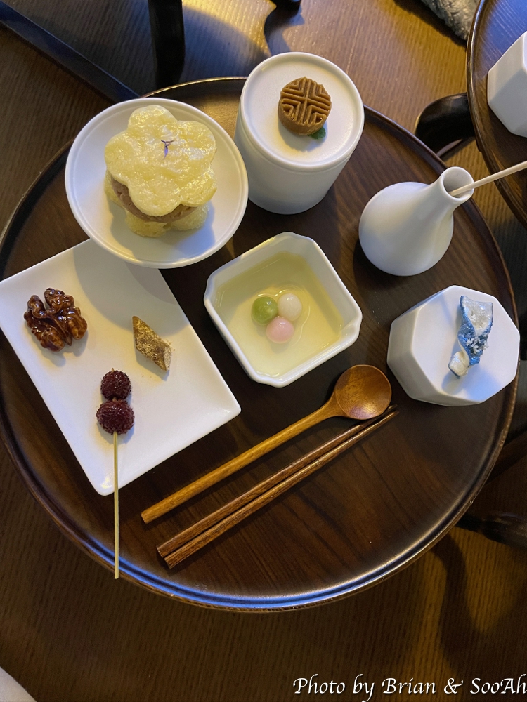 개인적으로는 전복 화양적이 사이드로 나온 김초무침과 함께 맘에 들어서 추가로 주문해서 또 즐겼네요. 그렇게 첫 조합을 즐기고 나면, 다음 조합으로는 낮 행사 때 나오는 다과상과, 이 달달한 다과상에 어울리는 화이트와인-골드트립션 리슬링 카비넷-이 나오더군요.