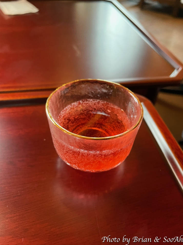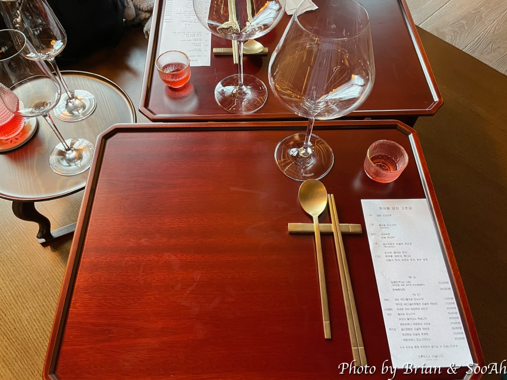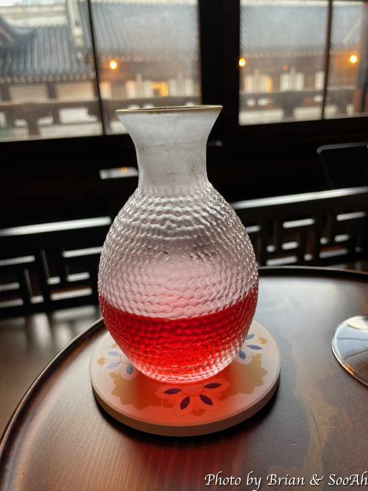 이번에는 조금 일찍 가서 첫번째로 도착한 관계로 가장 먼저 안내를 받아 들어갔습니다. 그리고 이번에는 테이블이 아닌 평상을 신청해서, 5곳의 평상 중에서 하나에 앉게 되었는데요, 자리에 앉으니 바로 웰컴 음료로 오미자주...로 기억하는 술이 나오더군요.