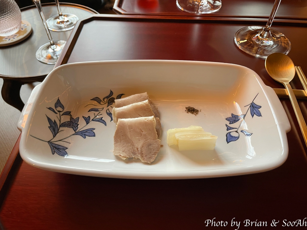 낮에 진행되는 행사와 달리 한식과 와인을 페어링 해서 제공하는데요, 처음에는 폴리움 피노누아라는 레드 와인과 페어링 되는 냉제육편과 전복 화양적이 나왔습니다.