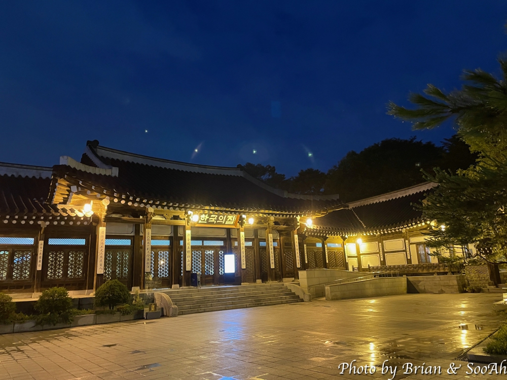 와인이나 플레이트는 추가로 주문하면 더 먹을 수 있지만, 일단 이 정도만 가볍게(?) 즐기면서 즐거운 시간을 보냈구요. 그렇게 먹고 나오니 이미 어두워진 한국의집의 모습을 사진에 남길 수 있었네요.