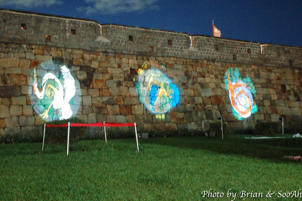 성벽을 따라서 그 옆에는 미디어아트 신진작가전 중 하나인 ‘당신이 있는 곳이 세상의 중심. 수원화성’이란 작품이 전시되고 있었네요. 뭔가 수원 화성의 4개의 성문과 그 주변 풍경을 원형 문양에 담아 둔 내용이었습니다.
