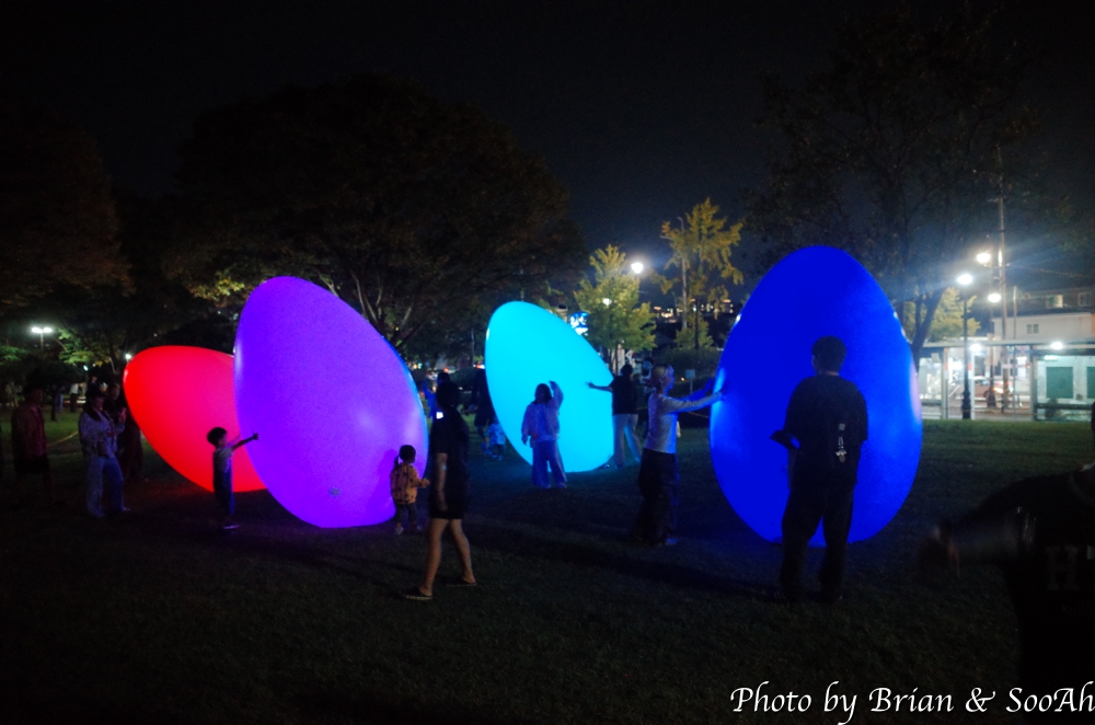 이 맞은편의 잔디밭에는 '빛의 태동'이라는 3m 정도의 달걀 모양의 터치형 LED가 있어서, 사람들이 즐겁게 터치하면서 색깔이 변하는 걸 즐기더군요. 그리고 그 옆에는 LED 돌다리가  있어서 애들이 뛰어 다니며 놀고 있더군요.