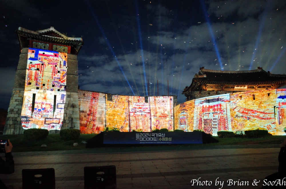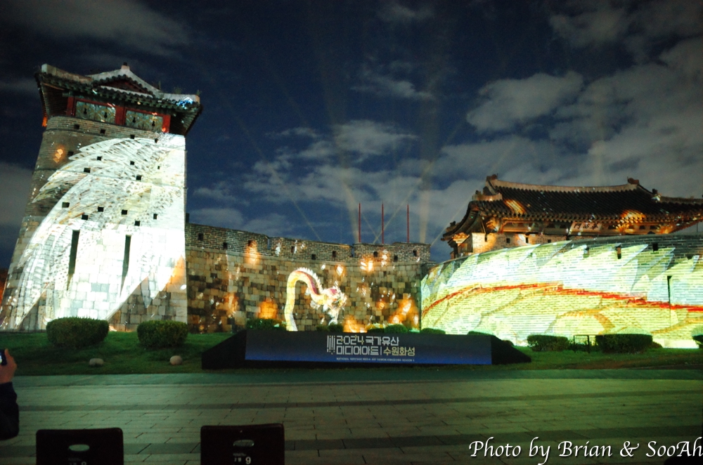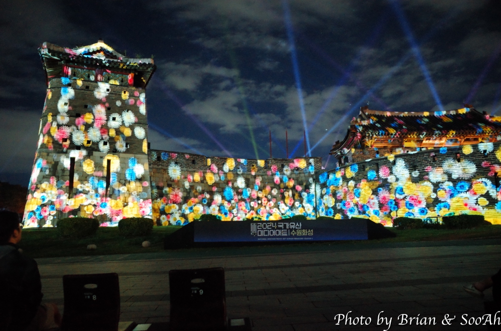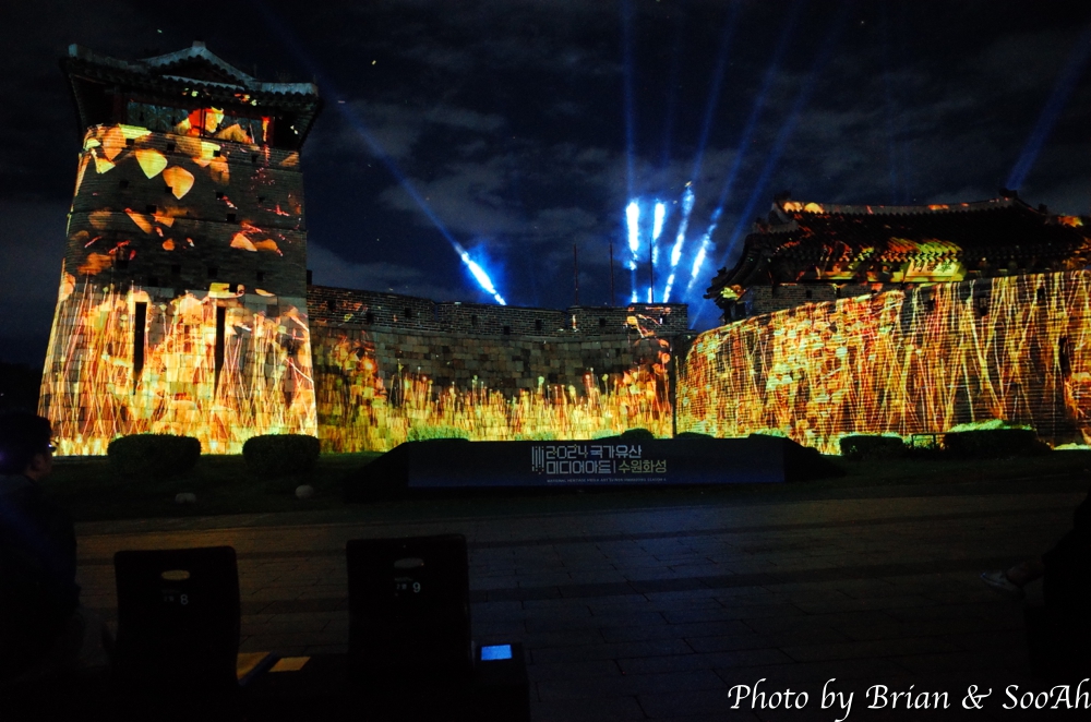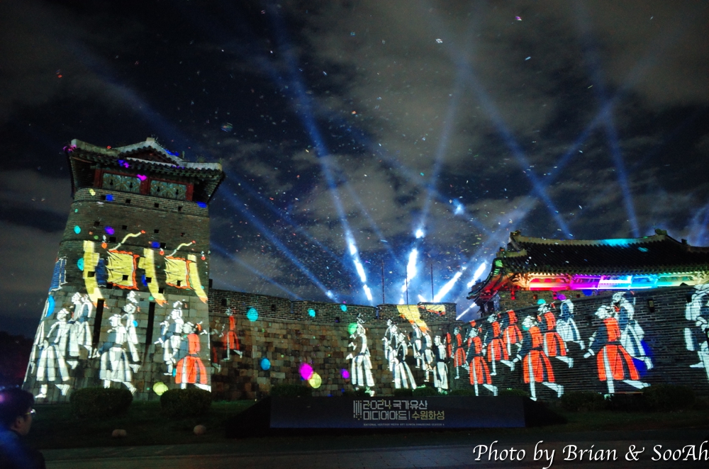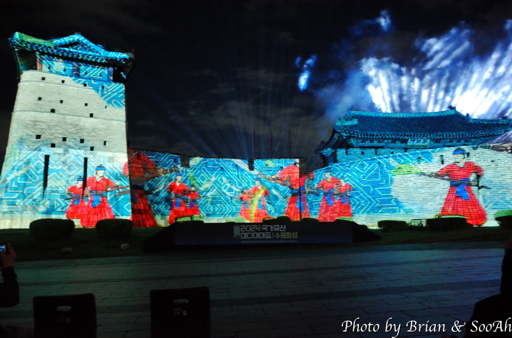 수원화성미디어아트는 매년 계속되고 있는데, 장소를 화서문에서 처음 했다가 화홍문, 창룡문 등으로 이동해서 했지만, 개인적으로는 화서문이 가장 나은 듯 합니다. 그리고, 워낙 많은 분이 찾아서, 왠만하면 지정석을 사전에 예매하고 보시는 게... 물론 서서 봐도 좋지만 워낙 사람이 몰려서... 9시라는 늦은 시간이었지만 의외로 많은 분들이 있어서 지정석 바깥에는 인산인해였는데, 지정석에서 편하게 볼 수 있었습니다.