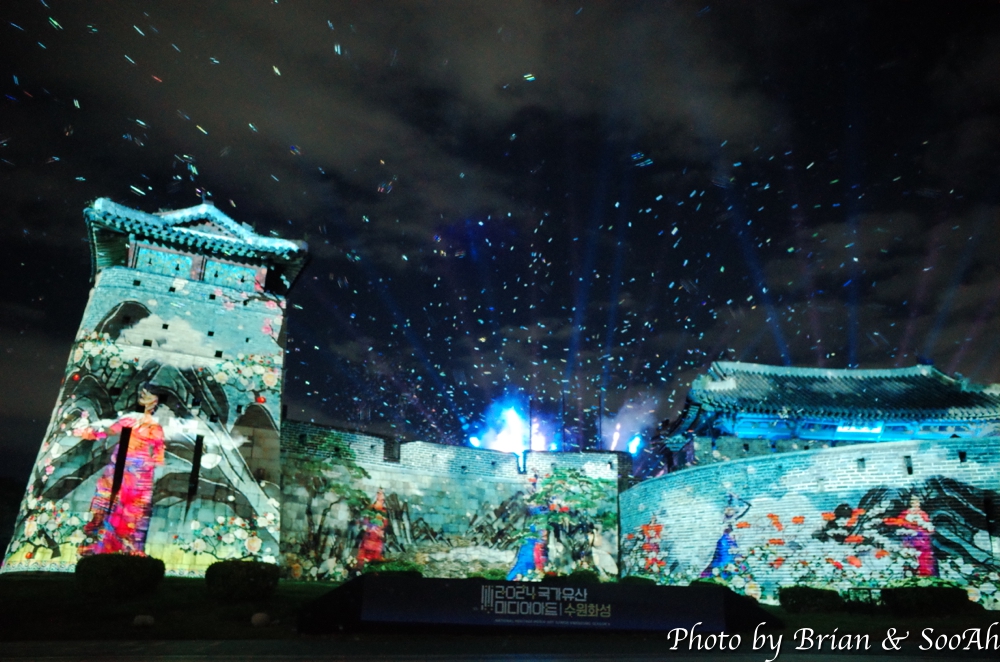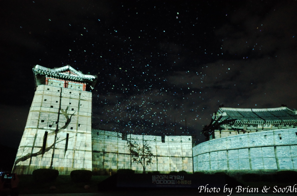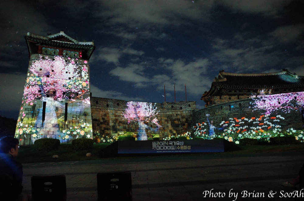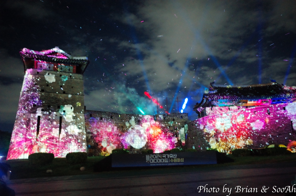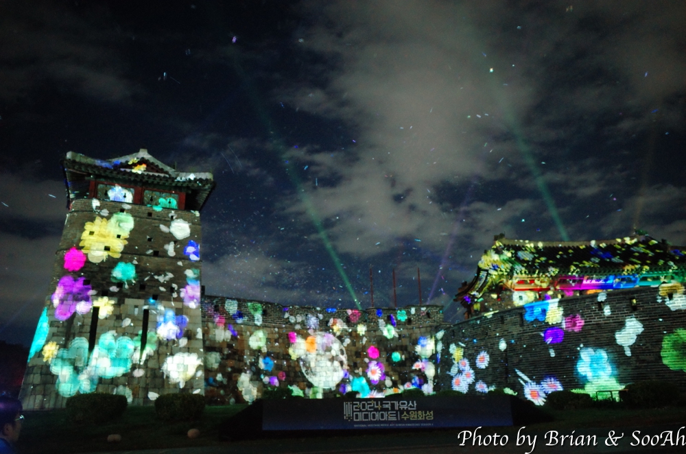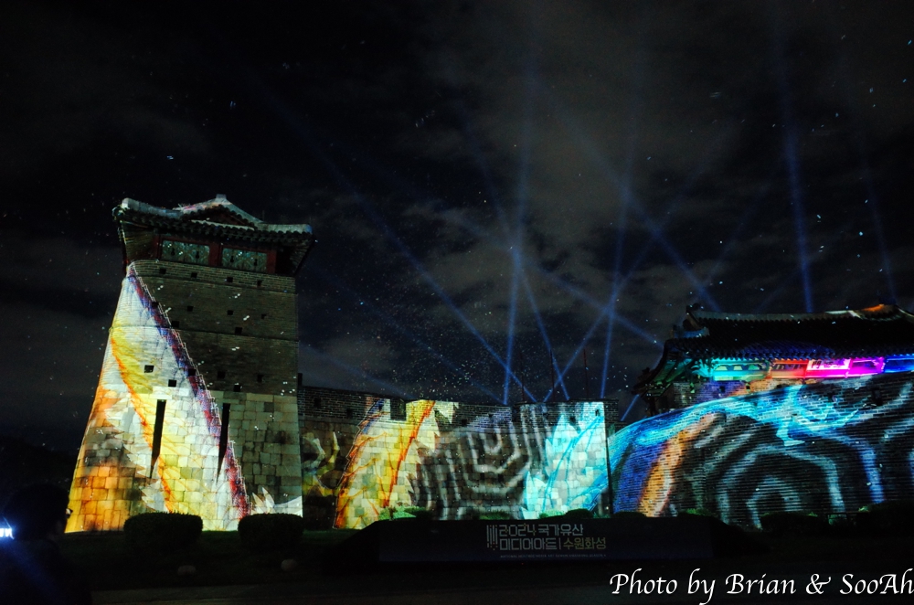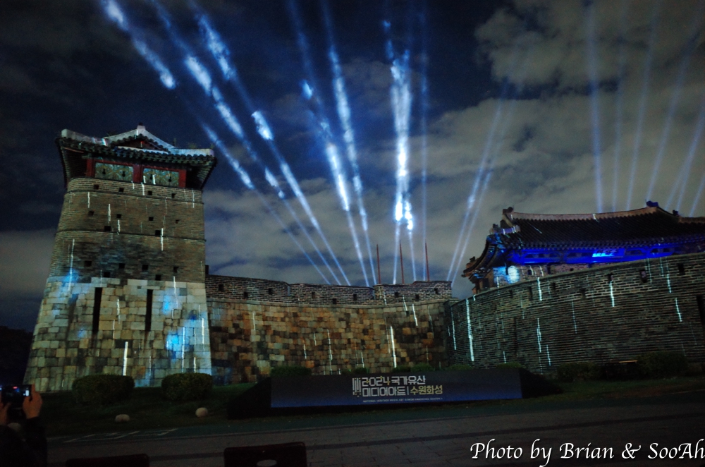 수원화성미디어아트는 매년 계속되고 있는데, 장소를 화서문에서 처음 했다가 화홍문, 창룡문 등으로 이동해서 했지만, 개인적으로는 화서문이 가장 나은 듯 합니다. 그리고, 워낙 많은 분이 찾아서, 왠만하면 지정석을 사전에 예매하고 보시는 게... 물론 서서 봐도 좋지만 워낙 사람이 몰려서... 9시라는 늦은 시간이었지만 의외로 많은 분들이 있어서 지정석 바깥에는 인산인해였는데, 지정석에서 편하게 볼 수 있었습니다.