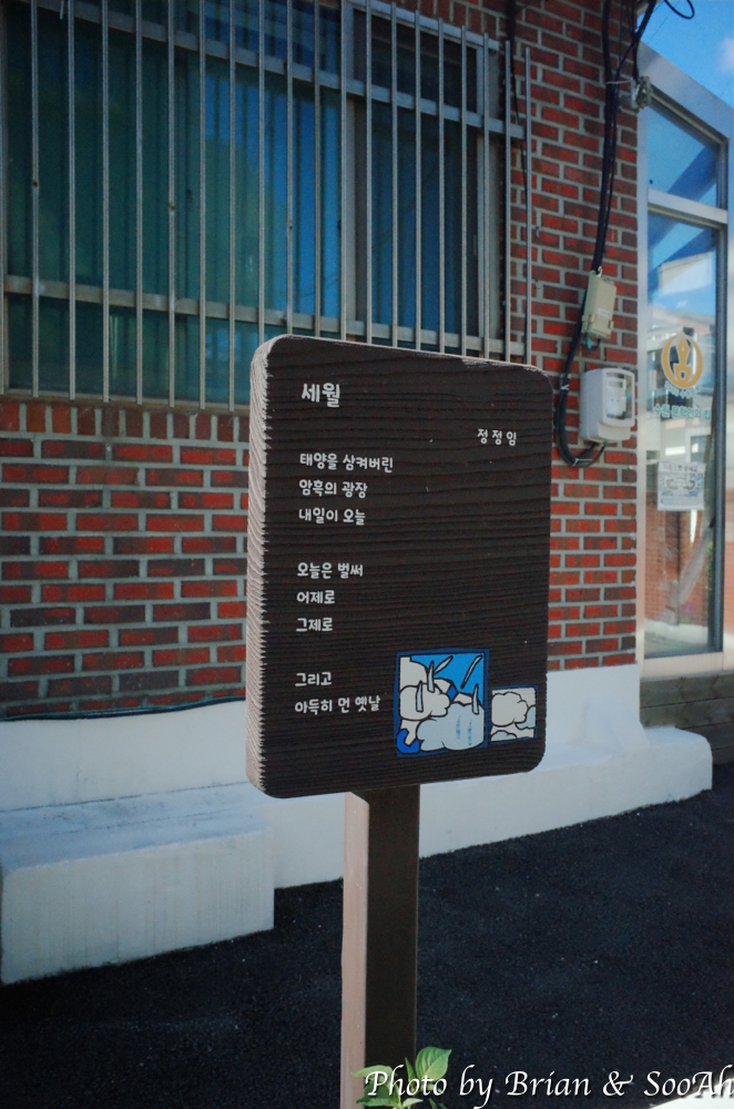 마을에 벽화를 그리면서, 그 곳에 사시는 할머님의 젊은 시절 자전거를 타던 사진을 그렸다는 얘기나 누가 서던 무조건 키가 커지는(측정하는 자?가 실제 높이보다 더 낮게 있어서..) 벽화 얘기. 빗물을 받아서 집 둘레로 나무들을 키울 수 있도록 지원해줬던 이야기. 그리고, 마을 사람들이 전부 잘 지내라는 의미로 집 앞에 '안녕하세요'라는 글귀와 동물들을 각각 각기 다른 동물과 언어로 해서 나무명패를 걸어뒀다는 얘기, 그리고 수원문학인의 집 이야기 등등이 기억 나네요.
