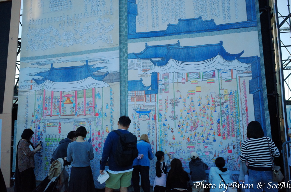 오히려 작년에 광장 바닥에 펼쳐진 의궤 그림을 시민들이 참여해서 색칠을 하게 했던 '시민도화서'는 시즌2를 맞이해서, 위의 관객석 벽에 같은 의궤 그림을 여러 개 설치해두고, 서서 색칠할 수 있도록 해줘서 좋았습니다. 그림을 롤을 돌려서 위아래가 이동하게 만들어 전체 그림을 색칠하게 해주는 것처럼 보였는데요. 그림 벽 앞에 진행요원에게 가서 그림에 표시된 숫자에 해당되는 색깔펜을 받아와서는 칠하면 되는 거였습니다. 시간이 좀 남아서 몇 그림 저도 색칠을 했는데요. 시작할 무렵에는 얼마 참여하지 않아 흰 곳이 많았는데, 오후에 다시 지나갈 때 보니 꽤나 많이 채워져 있더군요.