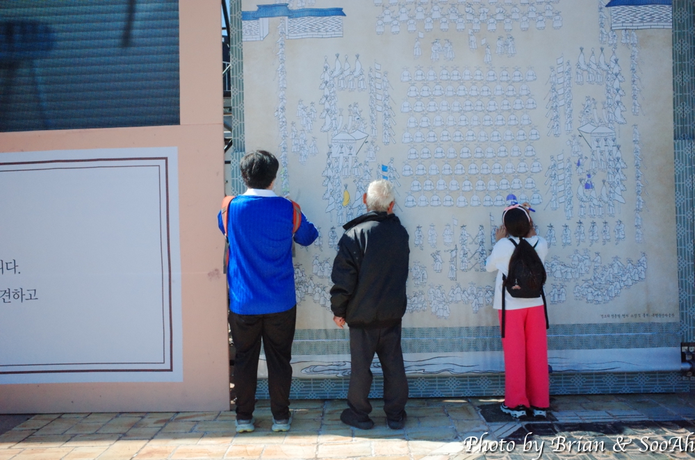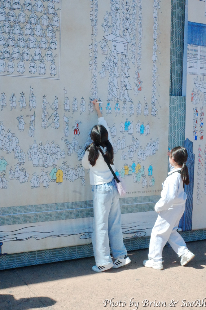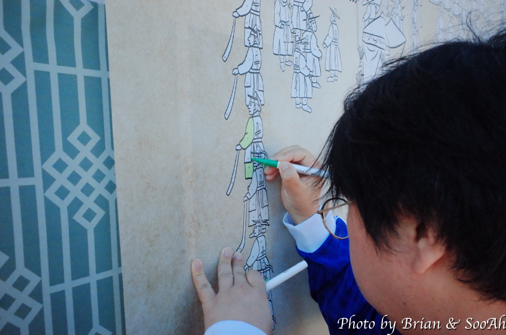 오히려 작년에 광장 바닥에 펼쳐진 의궤 그림을 시민들이 참여해서 색칠을 하게 했던 '시민도화서'는 시즌2를 맞이해서, 위의 관객석 벽에 같은 의궤 그림을 여러 개 설치해두고, 서서 색칠할 수 있도록 해줘서 좋았습니다. 그림을 롤을 돌려서 위아래가 이동하게 만들어 전체 그림을 색칠하게 해주는 것처럼 보였는데요. 그림 벽 앞에 진행요원에게 가서 그림에 표시된 숫자에 해당되는 색깔펜을 받아와서는 칠하면 되는 거였습니다. 시간이 좀 남아서 몇 그림 저도 색칠을 했는데요. 시작할 무렵에는 얼마 참여하지 않아 흰 곳이 많았는데, 오후에 다시 지나갈 때 보니 꽤나 많이 채워져 있더군요.