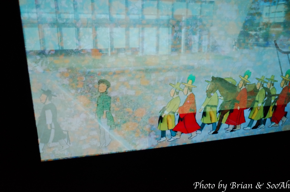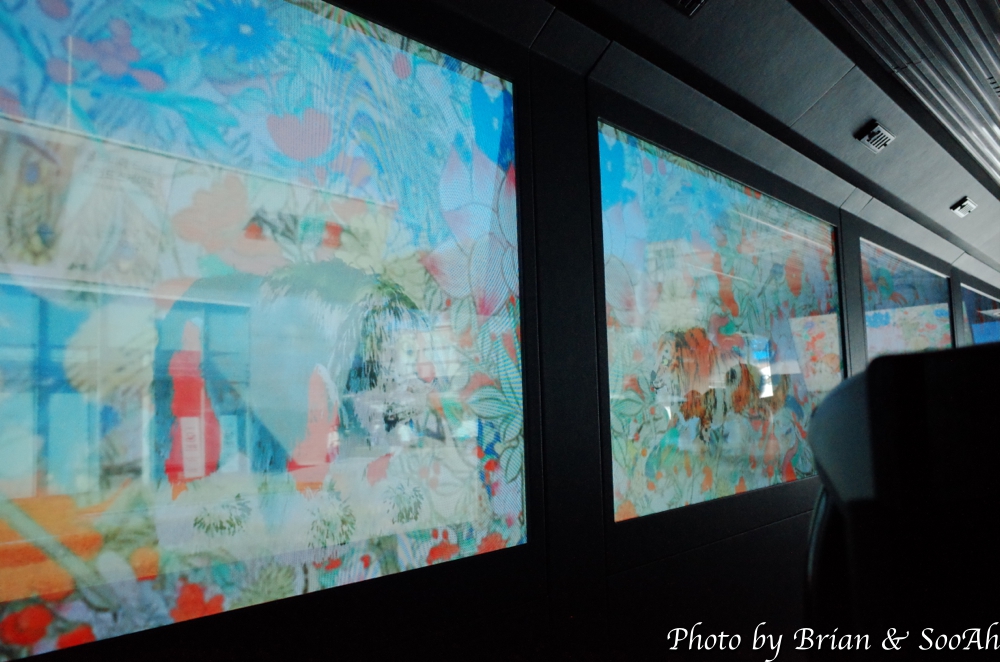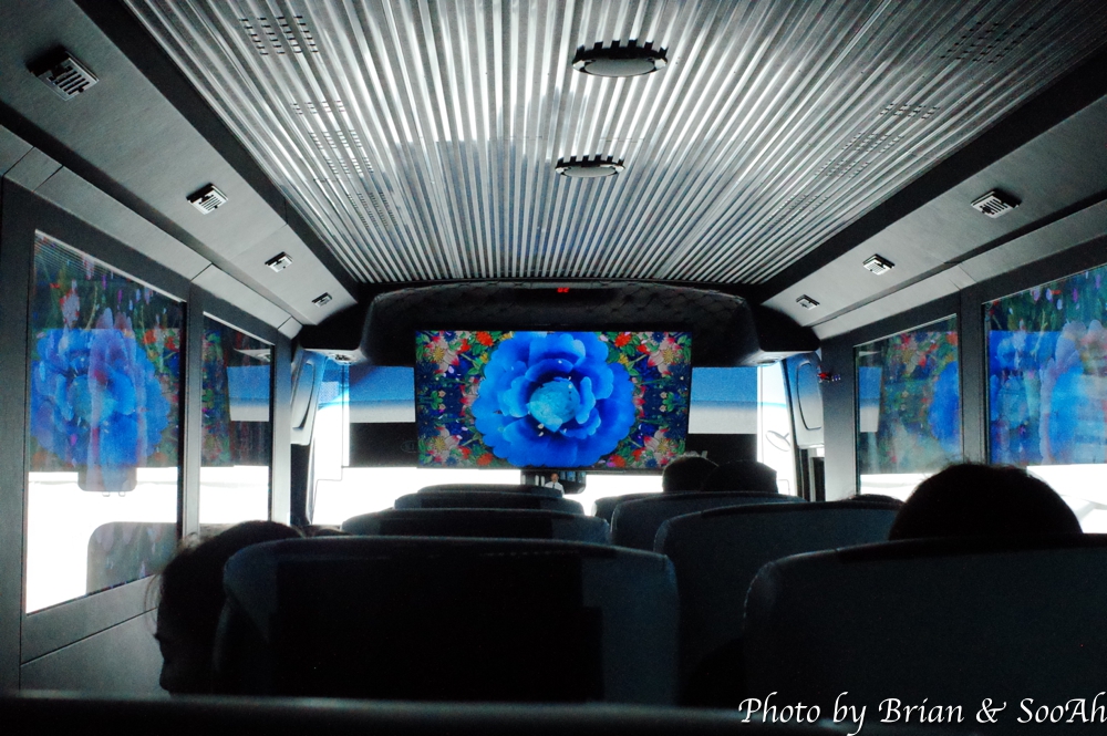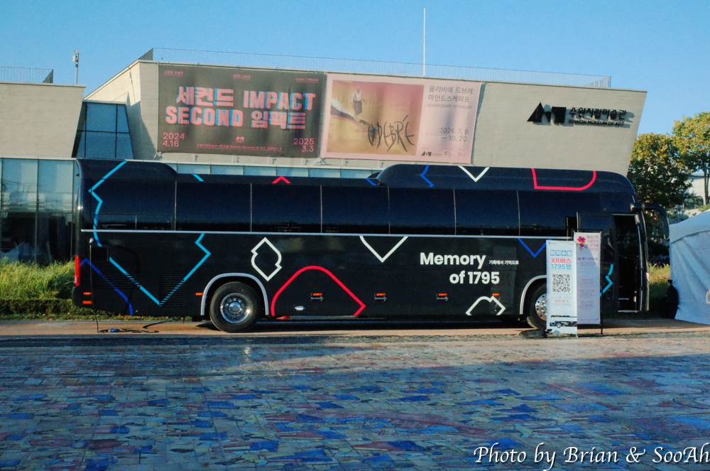 그 대여 부스 옆에는 <XR버스 1795행 체험>이라는 체험 공간이 있었습니다. 매시 정각과 30분마다 18명 정원으로 버스에 탑승해서 XR체험을 하는 건데요. 축제 기간이 아니어도 <터치 수원> 앱을 통해서 예약을 해서 체험할 수 있는 것으로 아는데, 저는 아직 못 해 봐서 다른 곳을 들렀다가 와서는 탑승을 해 봤습니다. 다른 버스와는 달리 좌석이 버스 가운데에 2개의 좌석 씩 일렬로 놓여 있었고, 양 옆의 창이 보니 2겹으로 되어 있어서 바깥쪽은 외부 빛을 차단하는, 그리고 내부는 영상이 유리창위에 표시되는 그런 구조였습니다. 실제 자리에 앉아서 볼 때는 영상이 잘 보였는데, 사진으로 찍으니 외부의 모습이 다 보이게 나와 실제 영상이 잘 나오지 않았네요. 영상은 예전에 국립중앙박물관 XR체험관에서 봤던 원행의궤반차도의 영상과 야조를 소재로 한 영상으로 약 10~15분 정도의 체험이었습니다.