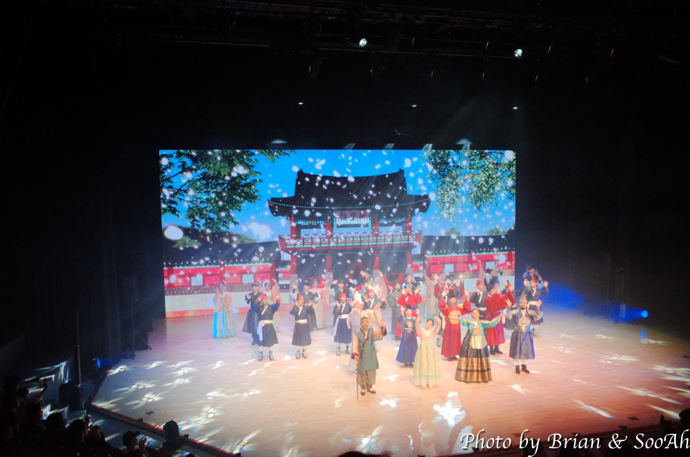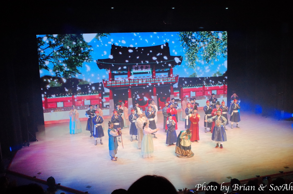 공연 사진은 촬영이 금지되었기 때문에 마지막 인사할 때만의 사진만 있는데요. 정조의 원행과 관련해서 정조와 혜경궁 홍씨가 겪어온 이야기들과 원행 때의 야조 등의 행사들을 창극 형태로 보여주는 공연이었습니다. 아래 사진처럼 무대 장치는 거의 없고, CG 등의 영상으로 배경/조명을 처리하는 그런 형태의 공연이었습니다.