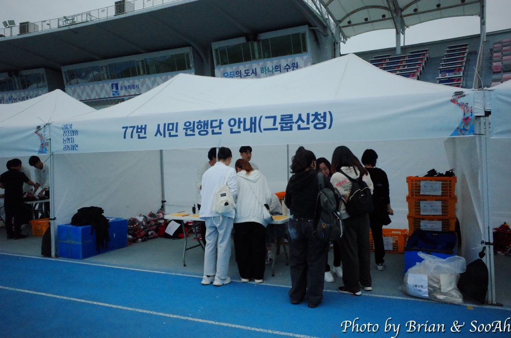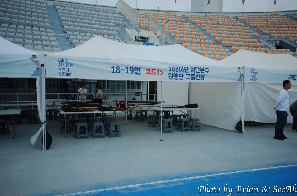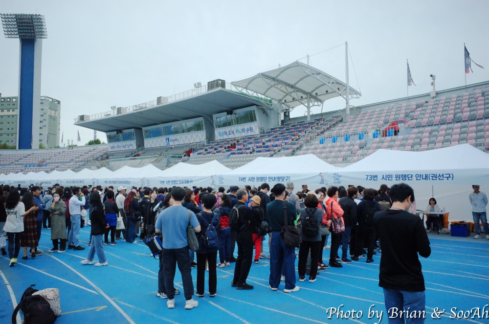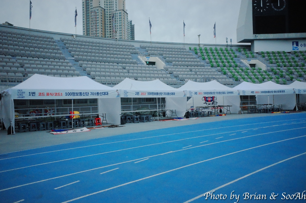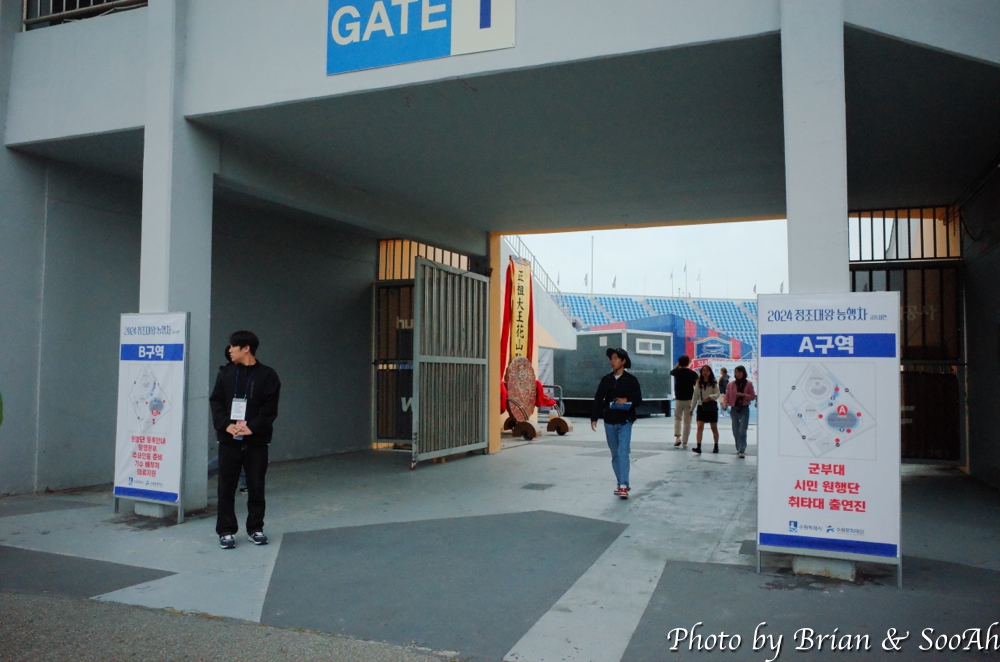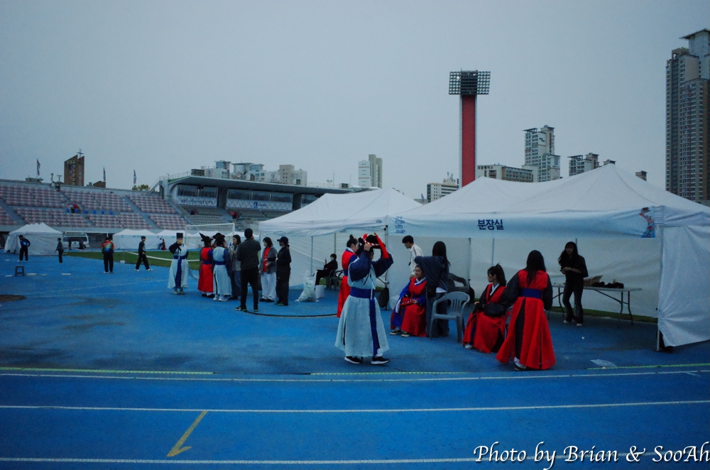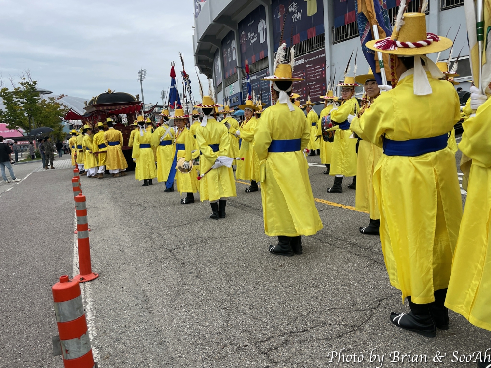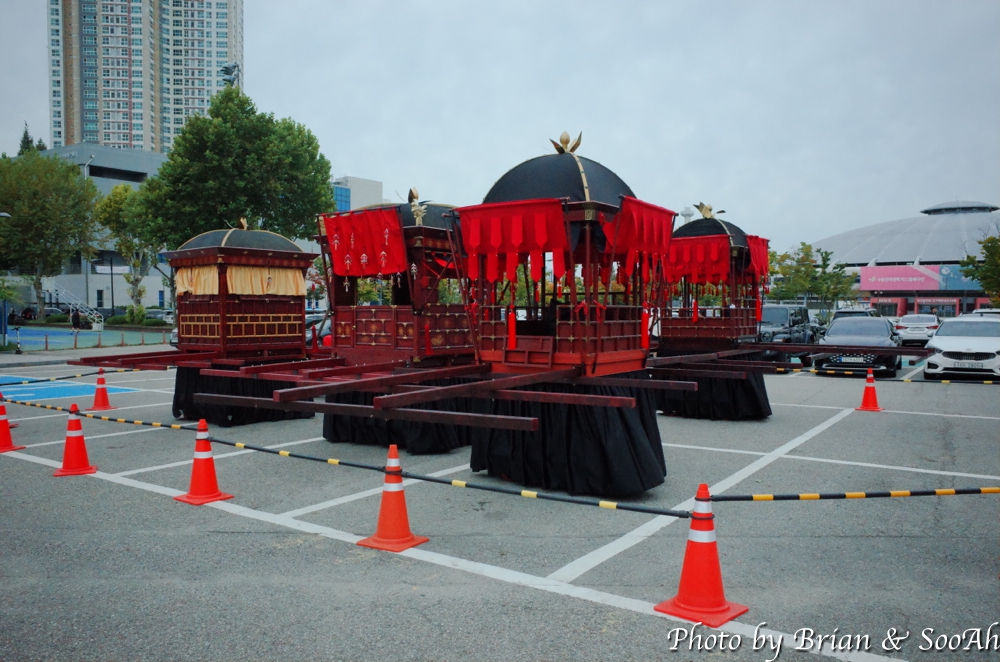 그러고는 행사 당일 오전 10시부터 수원종합운동장에 모이기 시작해서, 11시 반까지 집합을 해야 했습니다. 작년에는 2시까지만 가면 되었던 것으로 기억하는데, 재현 행렬의 일원이다 보니 아침 일찍 모이더군요. 가는 길에 이미 행차 관련해서 교통 통제가 시작되었고, 종합운동장 옆에는 행차에 사용될 가마나 기물들이 준비되어 있더군요. 그리고, 운동장에는 이미 많은 분들이 와 있었습니다.