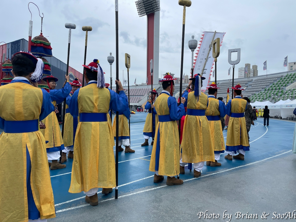 점심 이후에는 비가 부슬부슬 내리기 시작해서, 행차 중에도 비가 내릴까 걱정을 했는데, 그나마 행차 중에는 비가 오지 않아 다행이었습니다. 실제 행차 대열과 위치에 대해서는, 당일 현장에서 설명을 해주고 바로 투입이 되는 거여서, 2시 반부터인가 텐트 밖으로 나와서 현장감독이나 스태프 분들의 지시에 따라 팔찌에 있는 코드번호대로 기물을 받고 위치에 서게 됐는데요... 솔직히 이 부분은 각 텐트에 해당 텐트의 대열/배치도를 붙여 놨으면, 우왕좌왕하거나 시간이 오래 걸리진 않았을 거 같아서 조금 아쉬운 부분이었습니다. 운동장 내부에서 다 준비가 되지 않아서, 운동장 밖 출발 대기할 때 다시 정리를 하고 하면서 앞의 다른 그룹과의 거리 이런 것도 정리가 안 되서, 결국엔 두 그룹이 거의 붙어 다니는 아쉬움도 좀 있었구요.