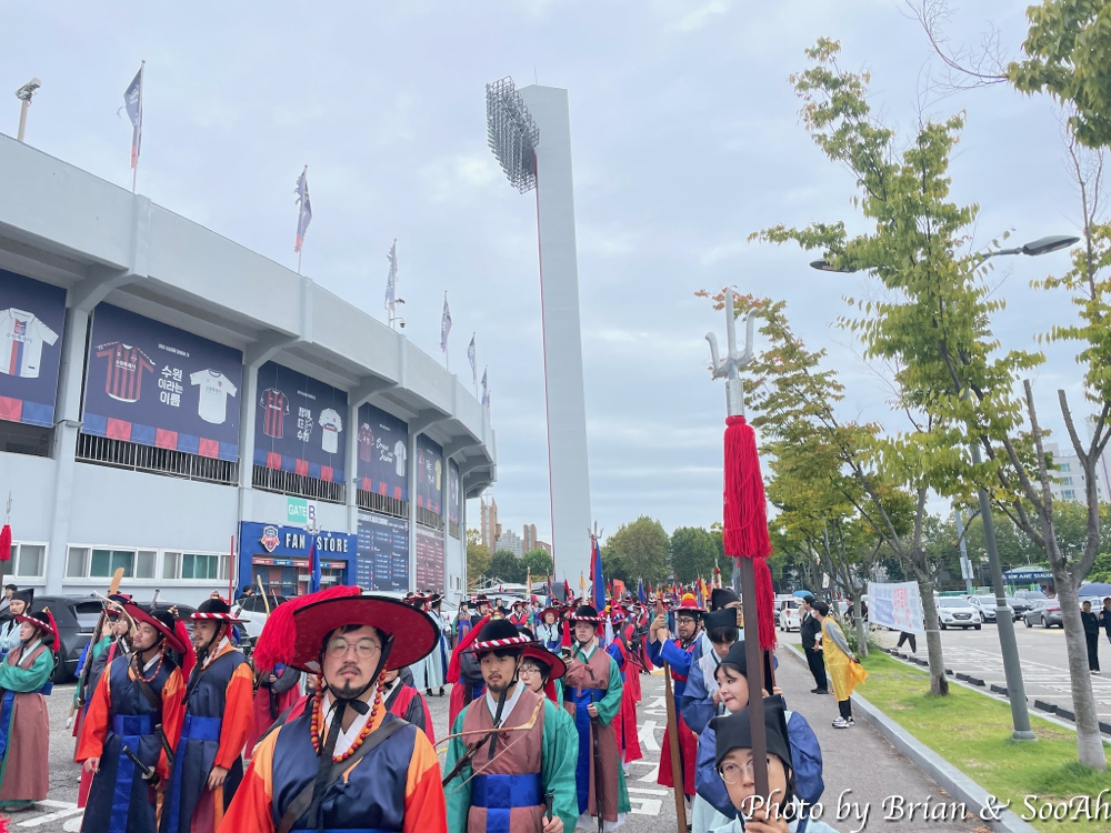올해에는 작년처럼 인터파크에서 체험 행렬을 모집하는 게 아니라, 구글 폼 같은 형태로 재현 행렬에 참여할 사람을 '수원문화재단' 공지로 올라와서 이를 신청하게 되었습니다. 작년에 봤던 재현 행렬에 참여했던 분들이 뭔가 지역 단체들에게 협조 공문을 통해 모은 게 아니라, 이런 형태로 진행이 되었던 거였더군요. 그리고, 올해는 작년과 같은 체험 행렬은 외국인 대상으로만 열리게 되어서, 내국인이 참여할 방법은 이 재현 행렬 중 하나로 참여하는 것 빼고는 없었는데.. 내년은 어쩔지 모르겠네요.