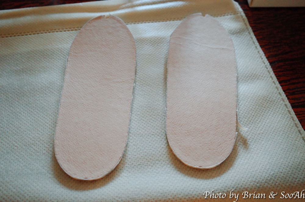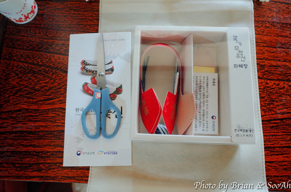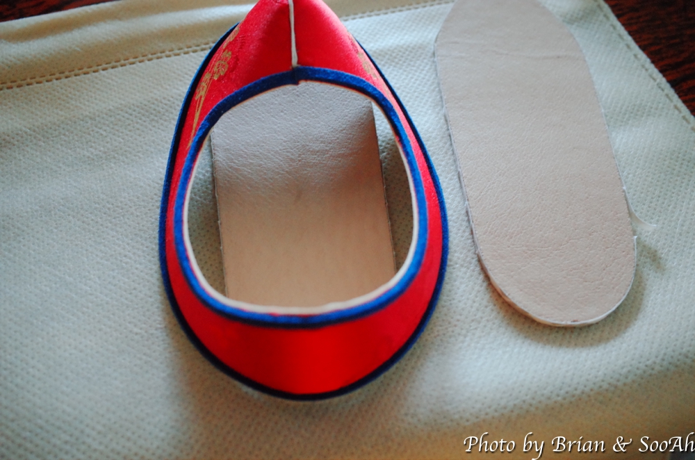 그 다음은 깔창...이라고 해야 하나요, 실제 발바닥 아래 놓이게 되는 부분을 좀 구부려주면서 부드럽게 한 후, 그 둘레에 붙어 있던 양면 테이프를 통해서 미리 만들어 놓은 신발 윗 부분과 붙여서 고정하는 작업을 했습니다. 원래의 화혜장에서는 풀을 발라서 하는 작업인데, 1시간 내 체험을 해야 하는 이 키트에서는 간단하게 양면 테이프로 대체해서 진행했습니다.