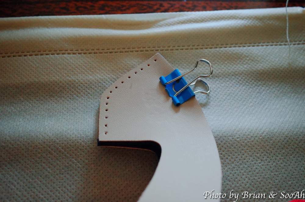 키트에서 내용물을 꺼내서 처음에 한 것은 꽃신의 둘레, 즉 발을 감싸는 부분이 되는 빨강의 재료를 꺼내서는 이를 반으로 접어서는 바느질을 통해서 하나로 이어주는 작업을 했습니다. 그렇게 이어주고는 이를 뒤집으니까 정말 신발의 윗부분 모습이 나오더군요. 그리고, 실로 앞의 갈라지는 부분의 실매듭이 보이지 않게 처리를 해서는 하얀 선으로 포인트 주는 부분도 매력적이었습니다.