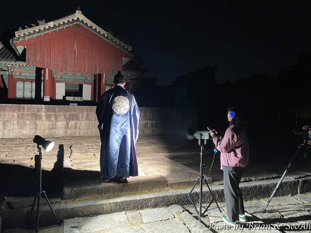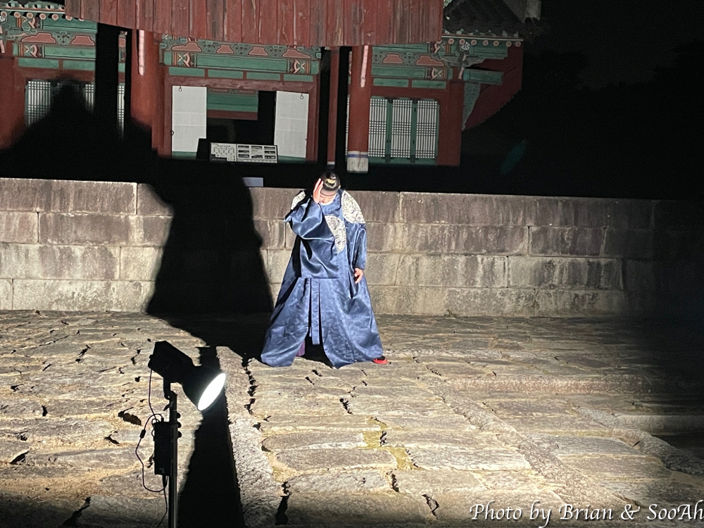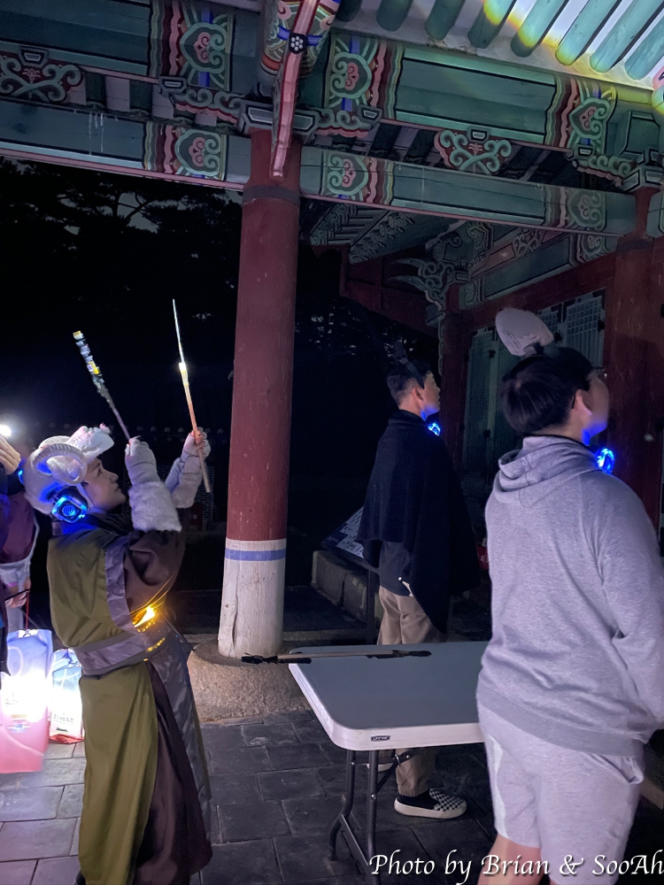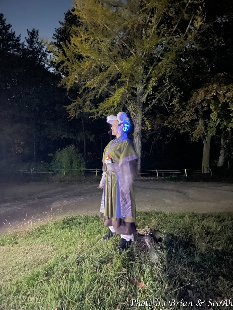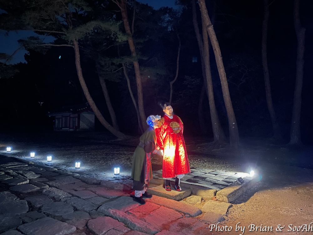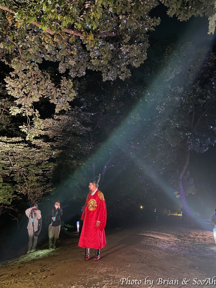 참가자가 다 오고 시간이 되니 이제 닫혀 있던 동구릉의 입장 게이트가 열리고, 일단은 어두운 길을 청사초롱의 불빛에 기대어 재실 앞 광장으로 가니, 이 날의 행사 가이드인 건원릉의 석양(^^)으로 분장한 분이 기다리고 계시더군요.