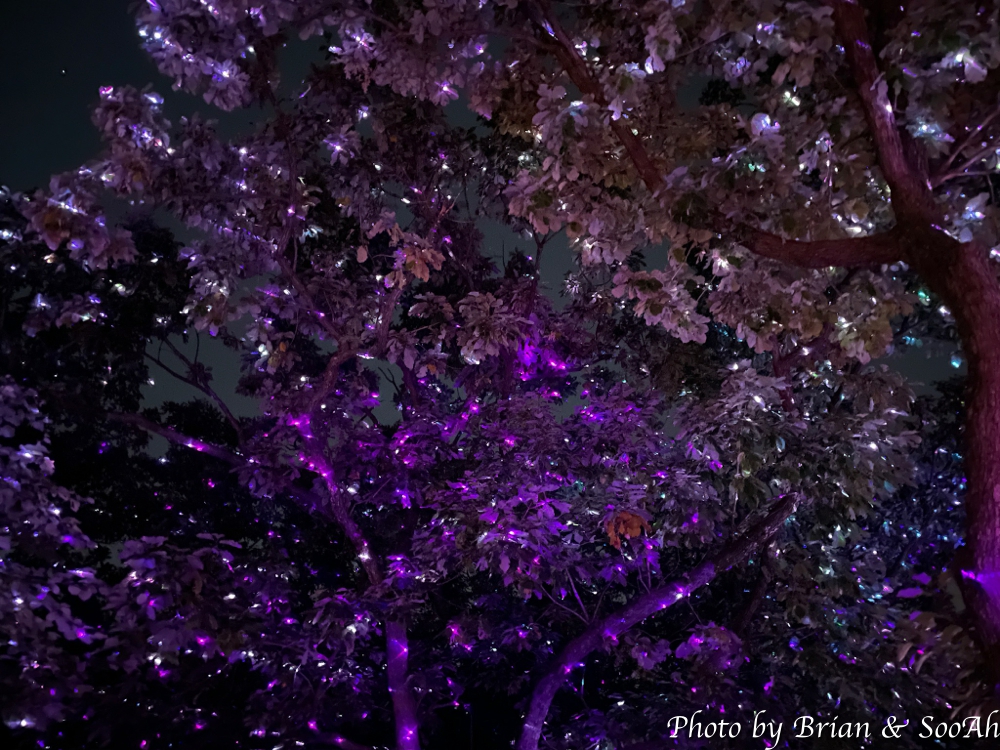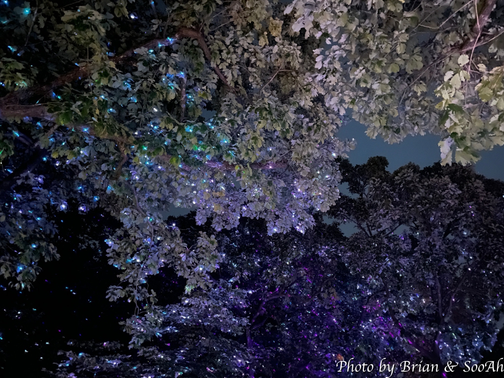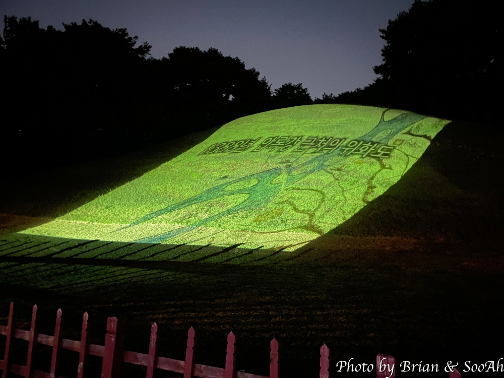 원릉에서 사도세자를 보고 나서는 계속 이동을 해서는 숭릉 앞에 있는 연지로 이동했습니다. 여기에는 조명을 통해서는 마치 반딧불이 엄청 있는 것 같은 미디어아트를 하고 있었습니다. 잠깐 관람을 하는데, 이 동구릉에서, 아니 조선왕릉에서 가장 윗어른인 태조...를 연기하시는 분이 나와서는 이런 저런 얘기를 하고, 같이 사진도 찍고 하는 시간을 가졌습니다.