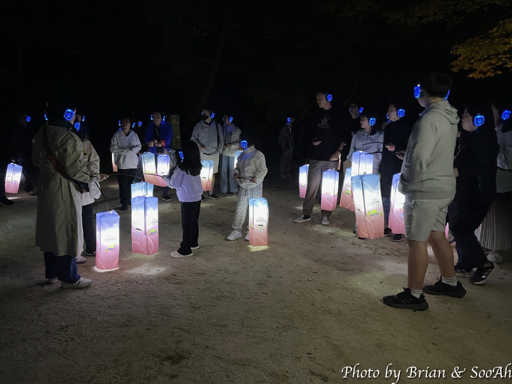 이렇게 한 바퀴 돌고 나오니, 동구릉 관람시간이 만료되어서 입장하는 곳이 문이 닫히고, 그렇게 조금 더 기다리니 이제 동구릉 야별행 행사를 참여하러 오시는 분들이 하나둘씩 모이고, 그렇게 참가자 확인을 하고는 행사 참여를 위한 여러가지를 나눠주더군요. 정말 걸어보니 진짜로 찰흙같은 어둠이었는데, 이를 걷기 위해 청사초롱을, 그리고 야광으로 빛을 내는 블루투쓰 헤드폰을 줘서 안내 가이드의 목소리도 듣고, 또 참가자가 어딨는지 확인도 하는 용도로 활용하더군요.