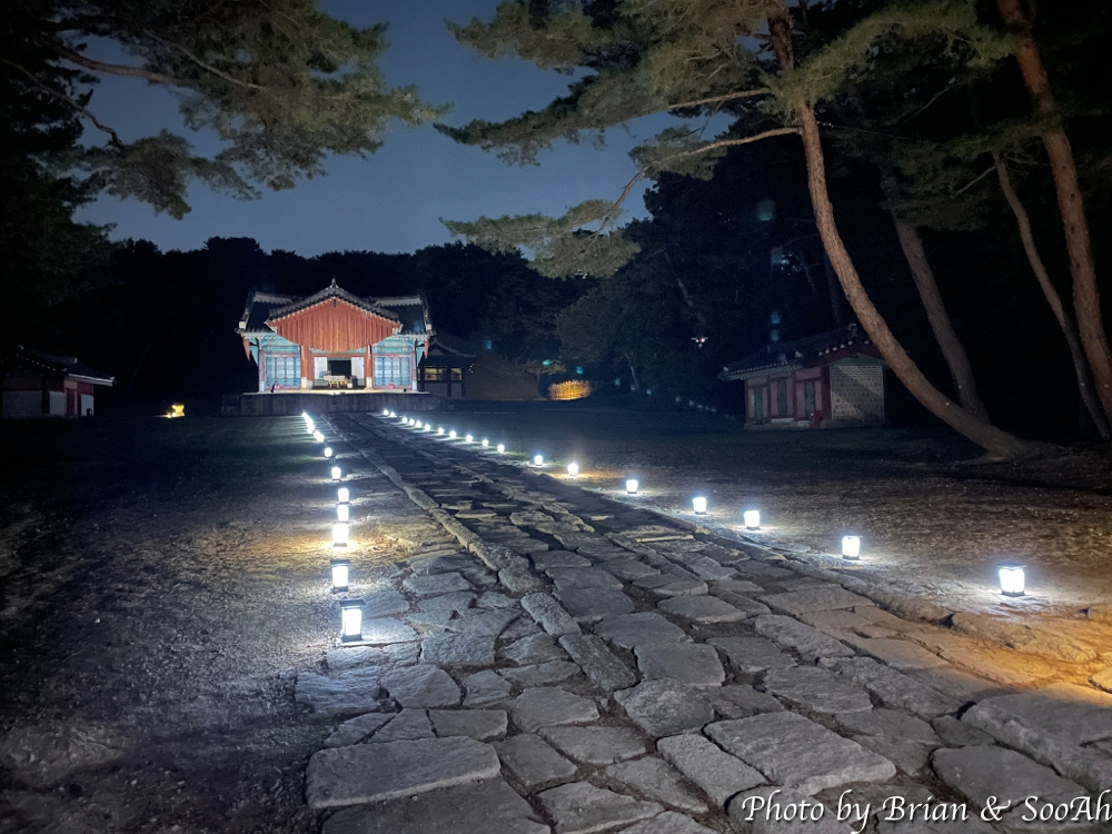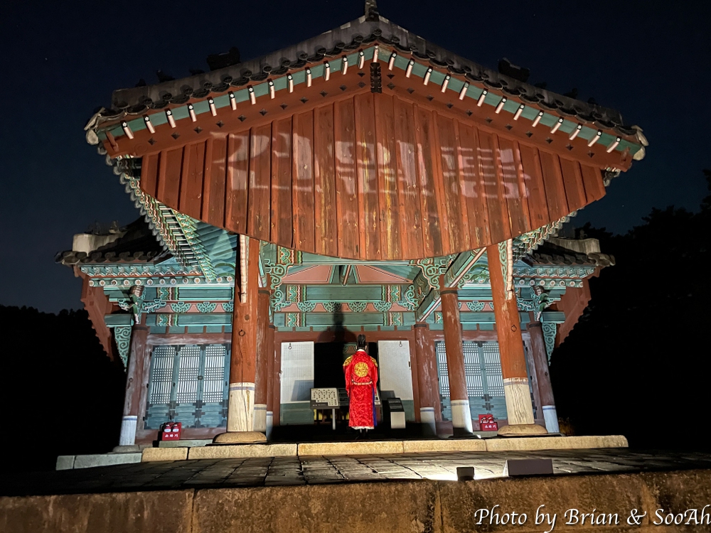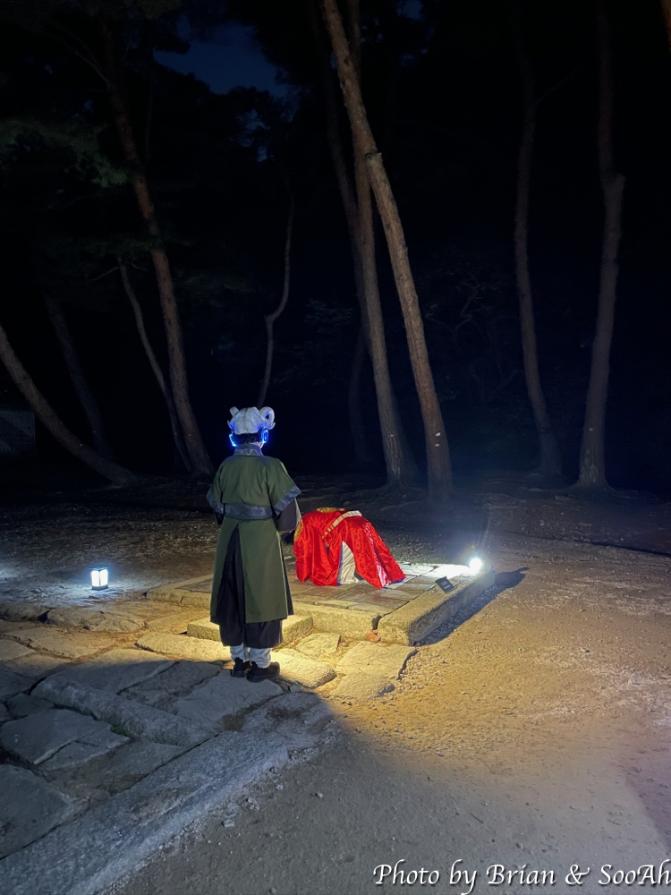 참가자가 다 오고 시간이 되니 이제 닫혀 있던 동구릉의 입장 게이트가 열리고, 일단은 어두운 길을 청사초롱의 불빛에 기대어 재실 앞 광장으로 가니, 이 날의 행사 가이드인 건원릉의 석양(^^)으로 분장한 분이 기다리고 계시더군요.