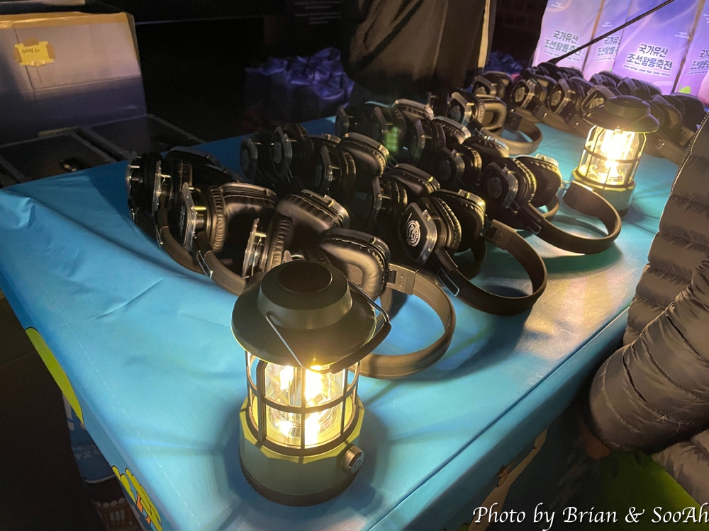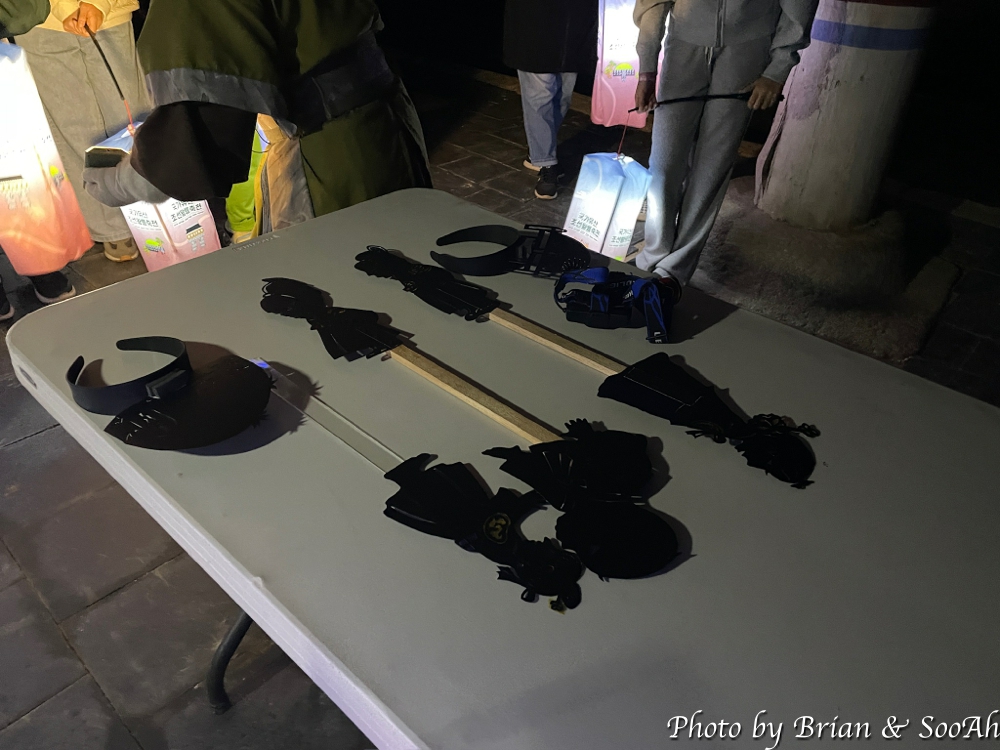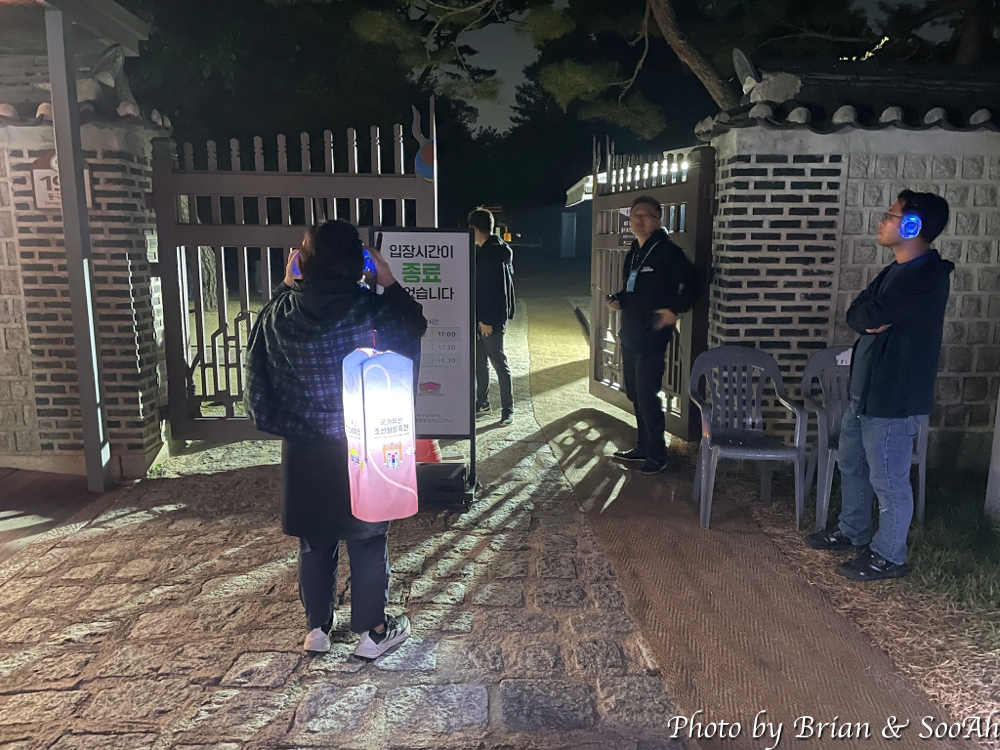 이렇게 한 바퀴 돌고 나오니, 동구릉 관람시간이 만료되어서 입장하는 곳이 문이 닫히고, 그렇게 조금 더 기다리니 이제 동구릉 야별행 행사를 참여하러 오시는 분들이 하나둘씩 모이고, 그렇게 참가자 확인을 하고는 행사 참여를 위한 여러가지를 나눠주더군요. 정말 걸어보니 진짜로 찰흙같은 어둠이었는데, 이를 걷기 위해 청사초롱을, 그리고 야광으로 빛을 내는 블루투쓰 헤드폰을 줘서 안내 가이드의 목소리도 듣고, 또 참가자가 어딨는지 확인도 하는 용도로 활용하더군요.