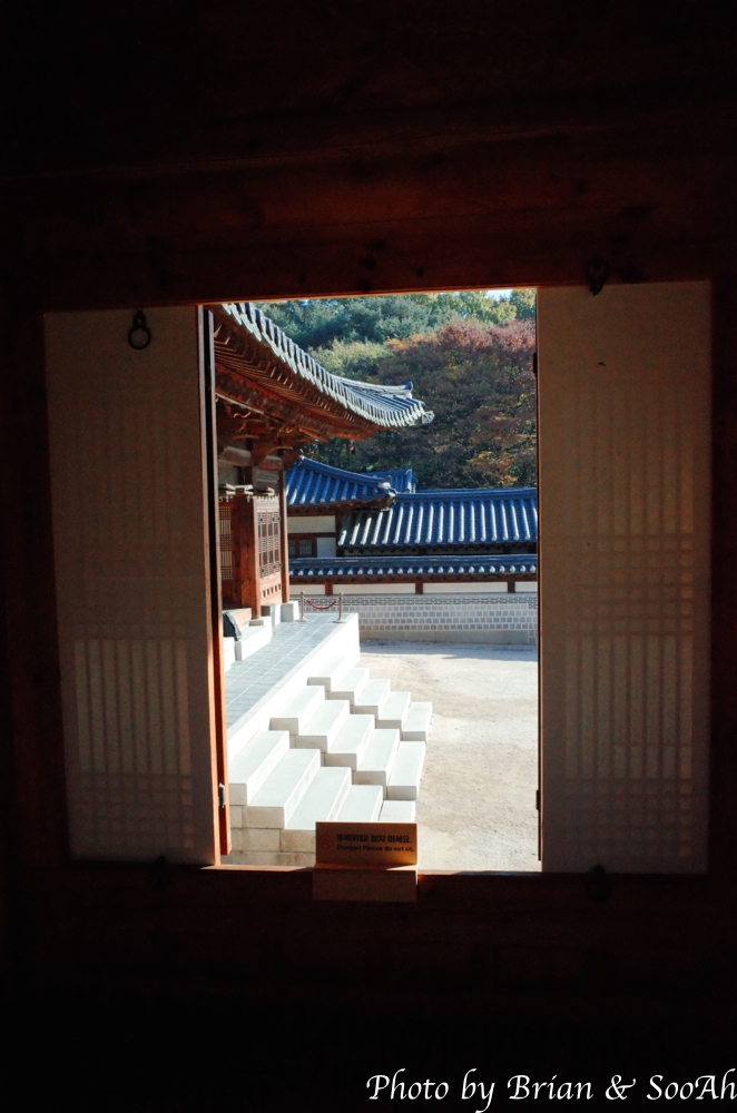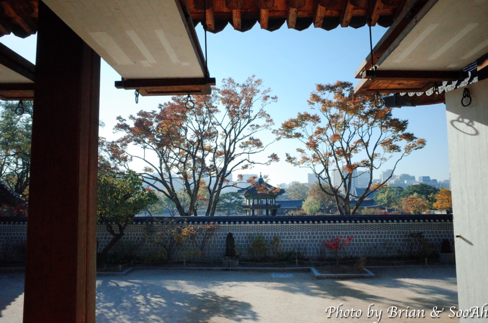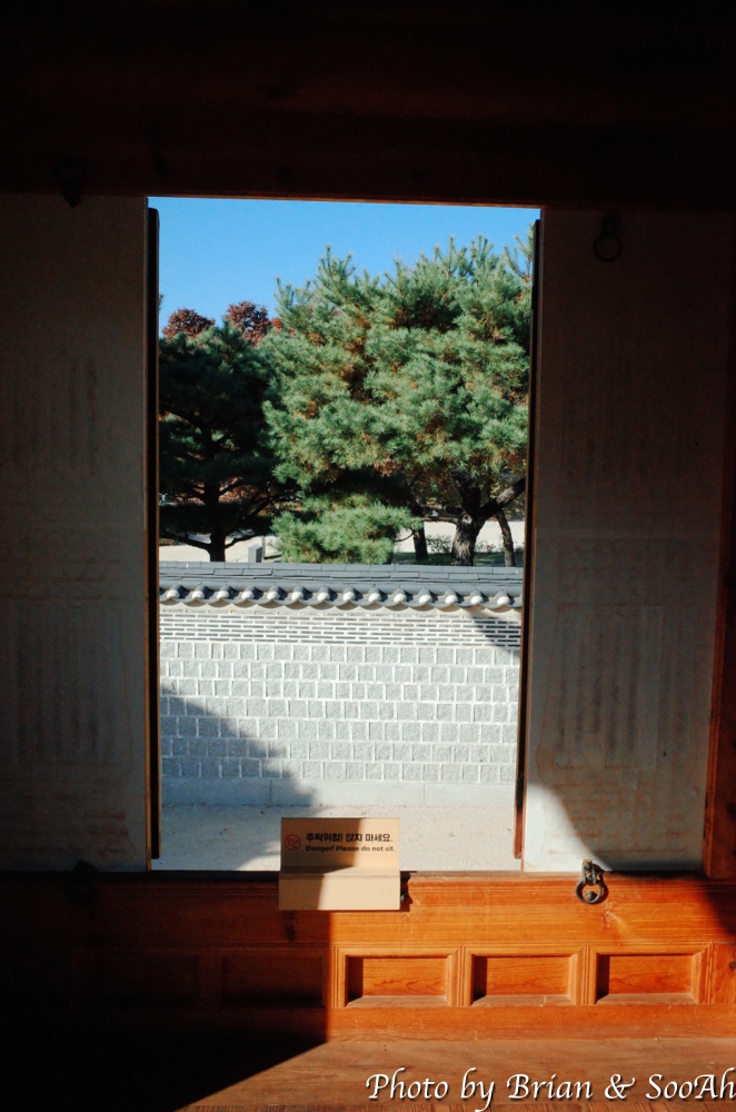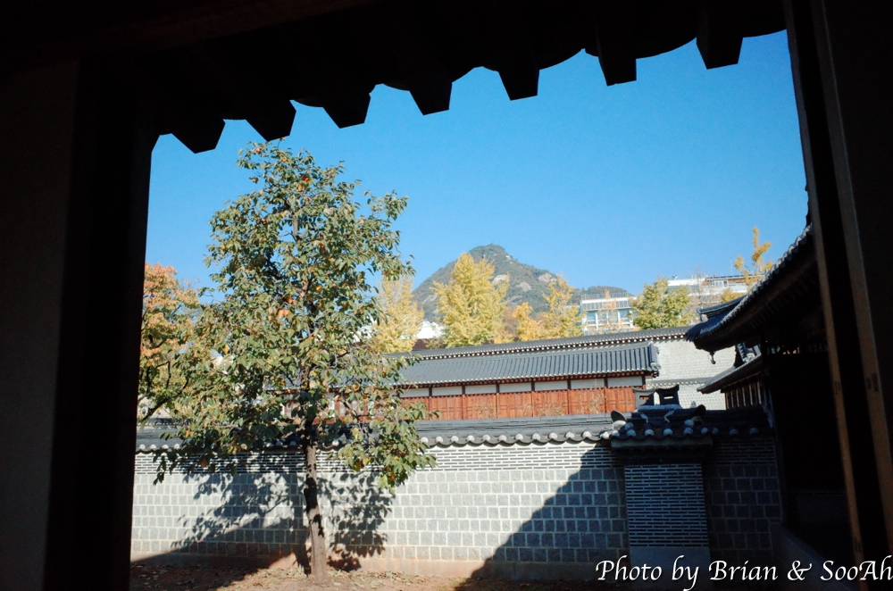 정화당에 대한 설명을 듣고는 정화당 못 가서 다시 동쪽으로 난, 아까 봤던 일월오봉도 벽 뒤쪽에 해당하는 복도각을 통해서 왕비의 공간인 곤녕합으로 이동했습니다. 이 복도각을 지나가면, 뒤쪽의 북한산 View 가 그림처럼 나오더군요.