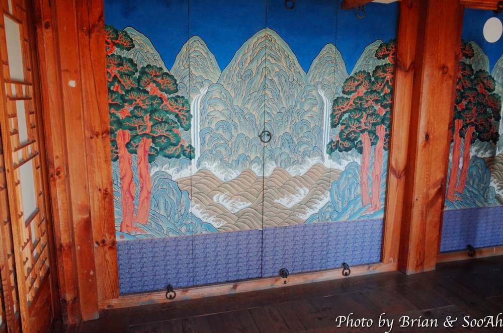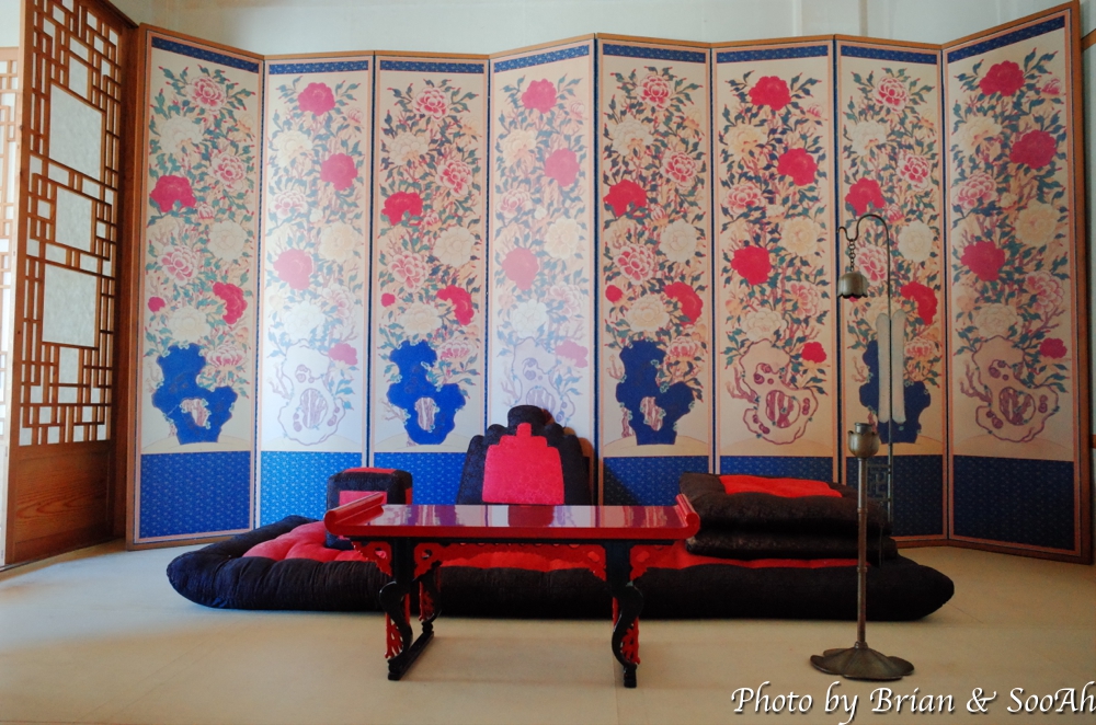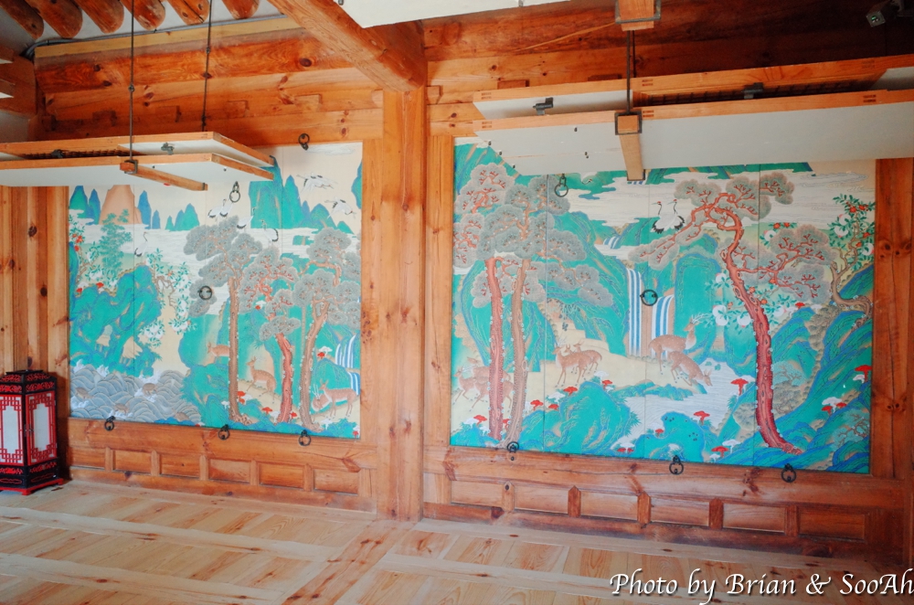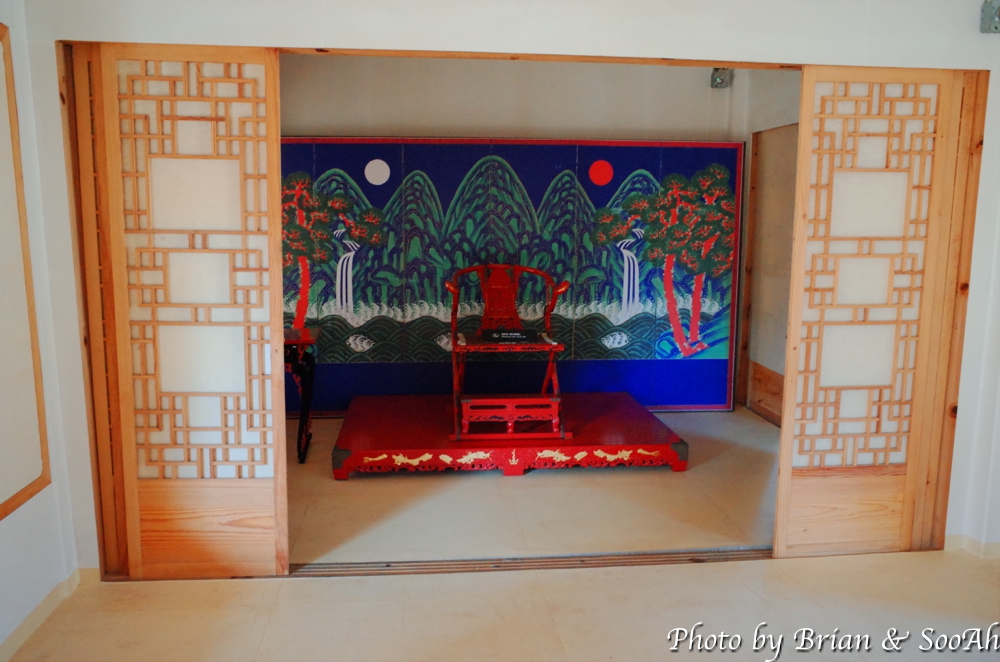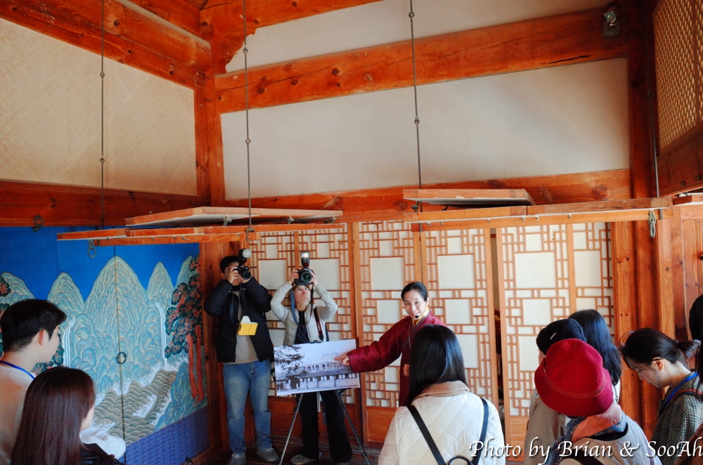 장안당 앞에서 간단한 장안당에 대한 설명을 듣고는 바로, 덧신을 신고는 장안당 내부로 입장했습니다. 먼저 윗 사진에서 세 개의 계단을 올라 문을 올려놓은 저 집무실 공간으로 들어가니 뒤쪽에는 일월오봉도가 그려져 있는 공간이더군요.