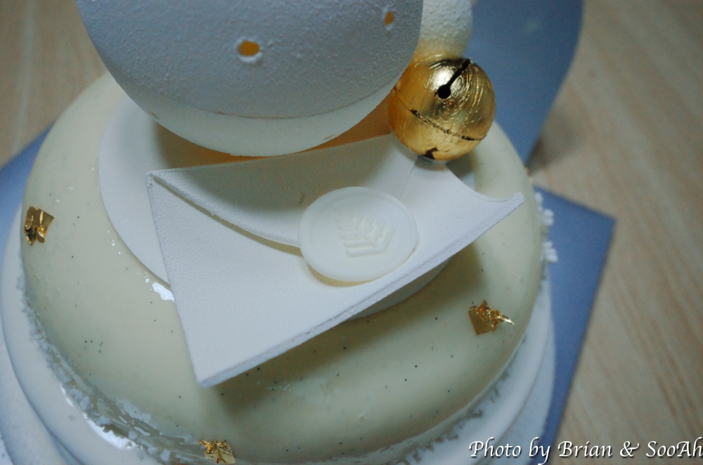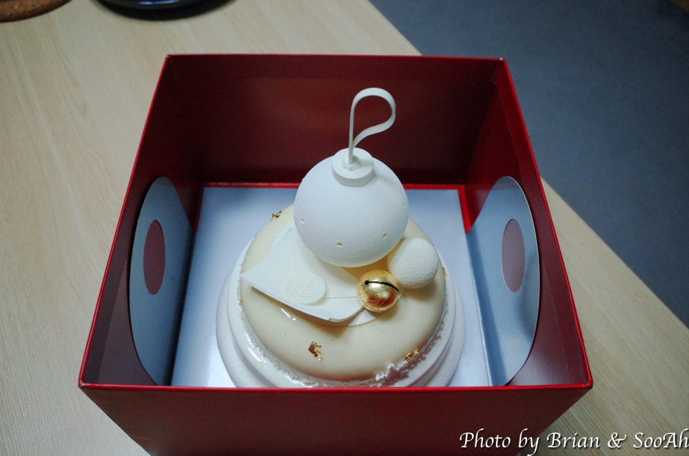 케이크 위쪽은 크리스마스 장식품이 화이트초콜렛으로 만들어져 놓여져 있었구요. 그 안은 비어 있었습니다. 그리고 그 아래쪽에 케이크와 그 둘레를 마시멜로가 고리 모양으로 둘러싸고 있었구요. 크리스마스 카드와 벨 모양의 금박 초콜렛과 하얀 초콜렛, 그리고 별이 데코로 붙어 있었습니다.