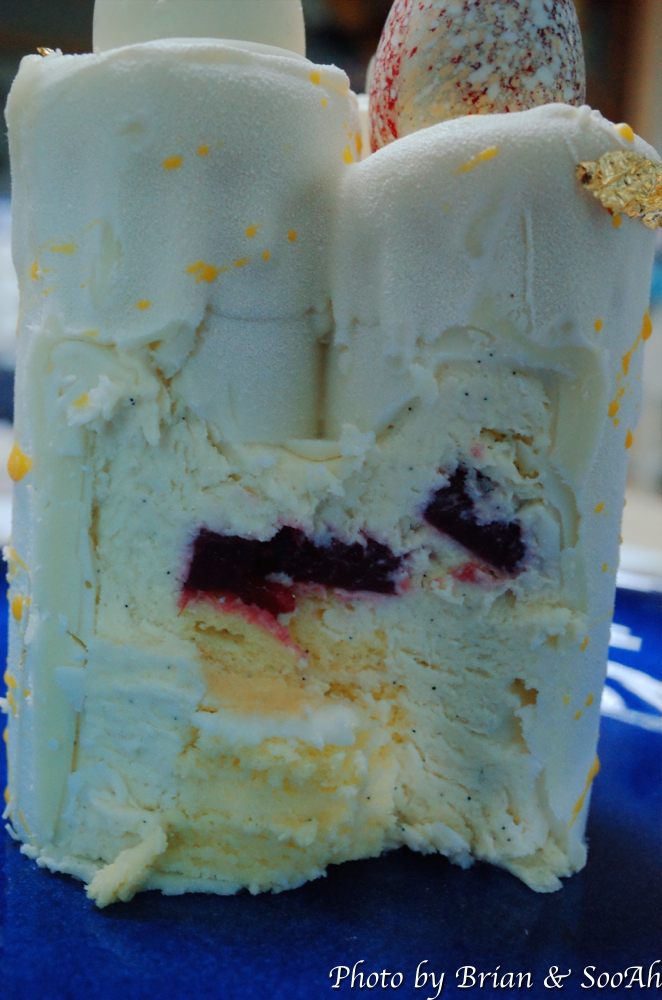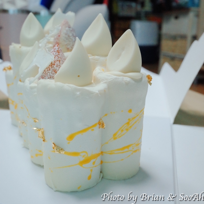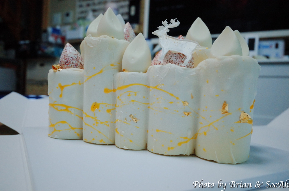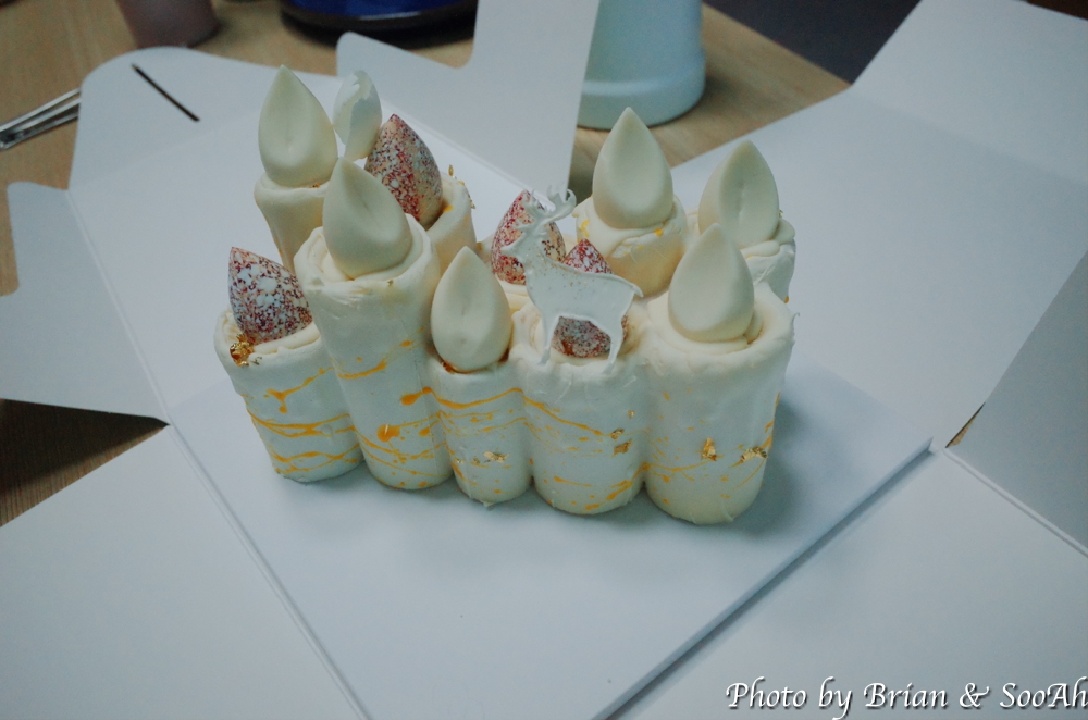 케이크는 외곽은 화이트 초콜렛에 데코가 있었구요. 초 모양은 화이트 초콜렛이 모양을 만들고 있으면, 그 안은 바닐라와 산딸기가 있어서, 뭔가 아이스크림 케이크를 먹는 느낌도 나고, 또 다양한 맛이 나와서 올해도 실망시키지 않는 퀄리티를 보여준 쟈댕디베르였는데요.