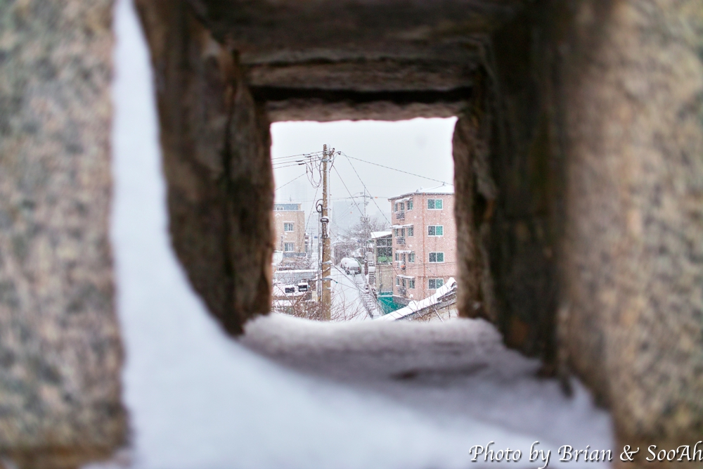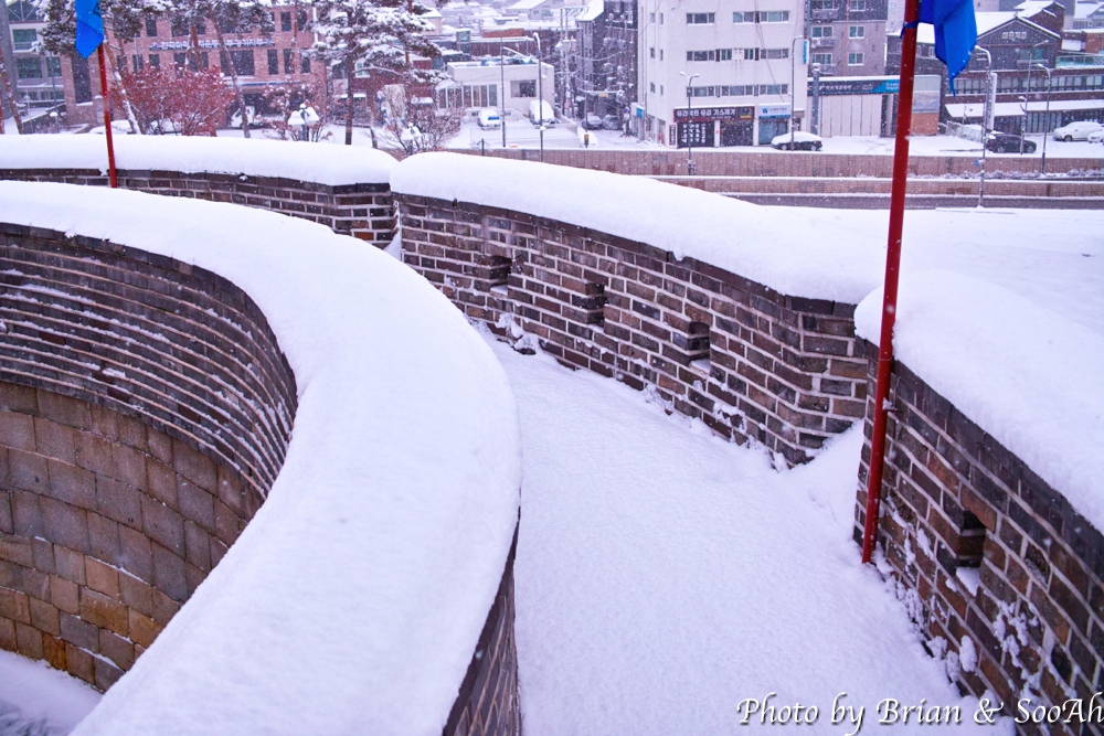 창룡문 옆으로 계단을 겨우겨우 올라가서는 성곽을 따라 걷기 시작했습니다. 성곽 위에도 눈이 많이 쌓였지만, 성곽 안팎으로의 마을에도 눈이 엄청 쌓여 있더군요.