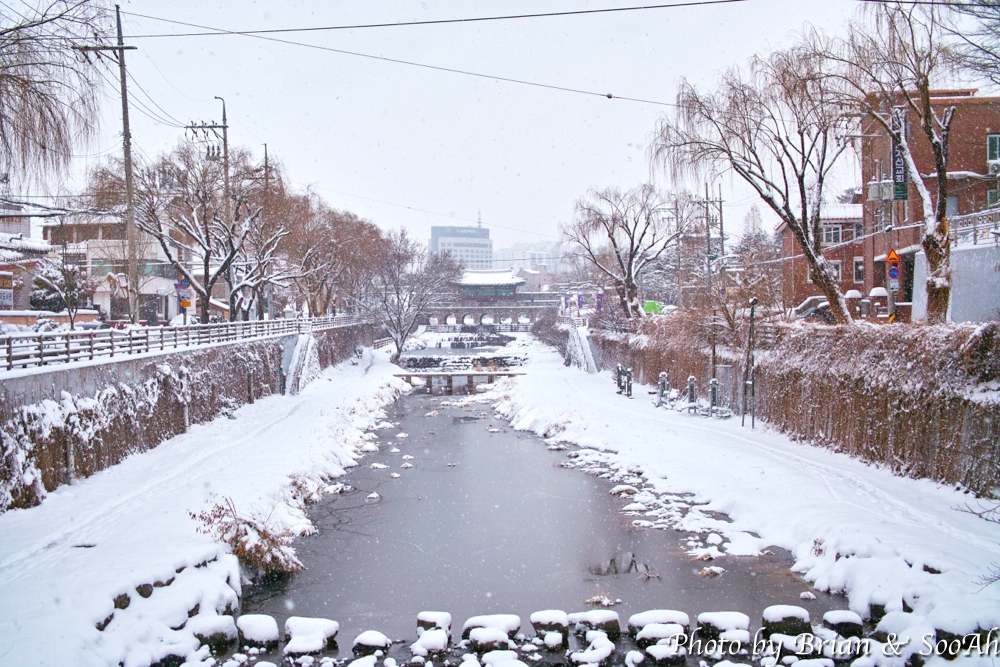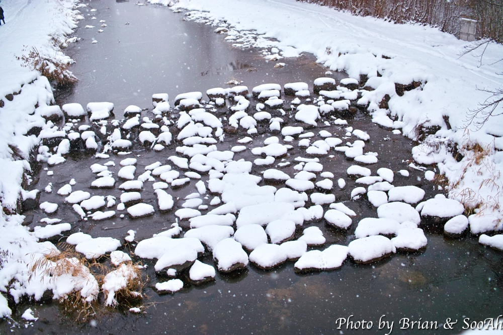 조심조심 내려와서는 팔달구청 앞을 지나서는 수원천을 따라 걸어서는 화홍문 쪽으로 올라갔습니다. 수원천에도 눈이 엄청 쌓여 있더군요.