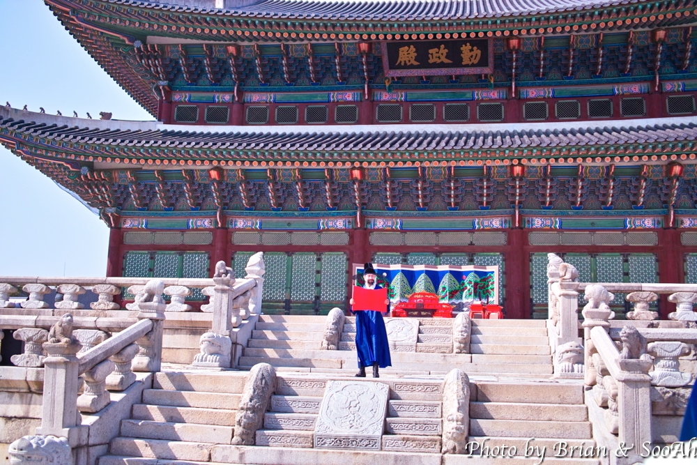 이렇게 체험별로 인솔하는 분의 깃발 아래서 서 있다가, 경복궁 안으로 입장하면.... 작년에는 세종이 문무백관에게 보고를 받는 재현행사에 직접 참여(라고는 하지만 그냥 도열해 있는 것)를 했었는데, 올해는 재현행사를 하는데 근처에서 일반 관객처럼 구경을 한 다음에, 행사가 끝나는 마지막 무렵에 세종대왕이 나가고 난 뒤, 문관이 나와서는 교지를 내리는 것처럼 해서 체험행사를 하는 궁중새내기에 안내를 하는 2부처럼 운영을 하더군요. 뭐 그렇게 실제 체험행사를 하는 곳으로 이동을 시작했습니다.