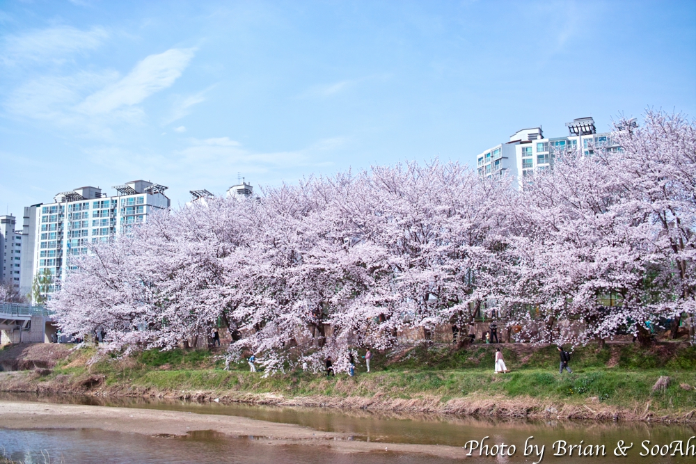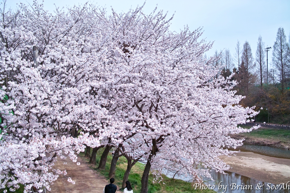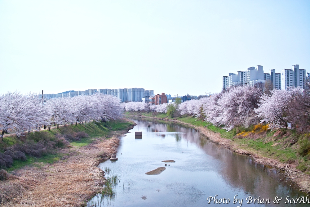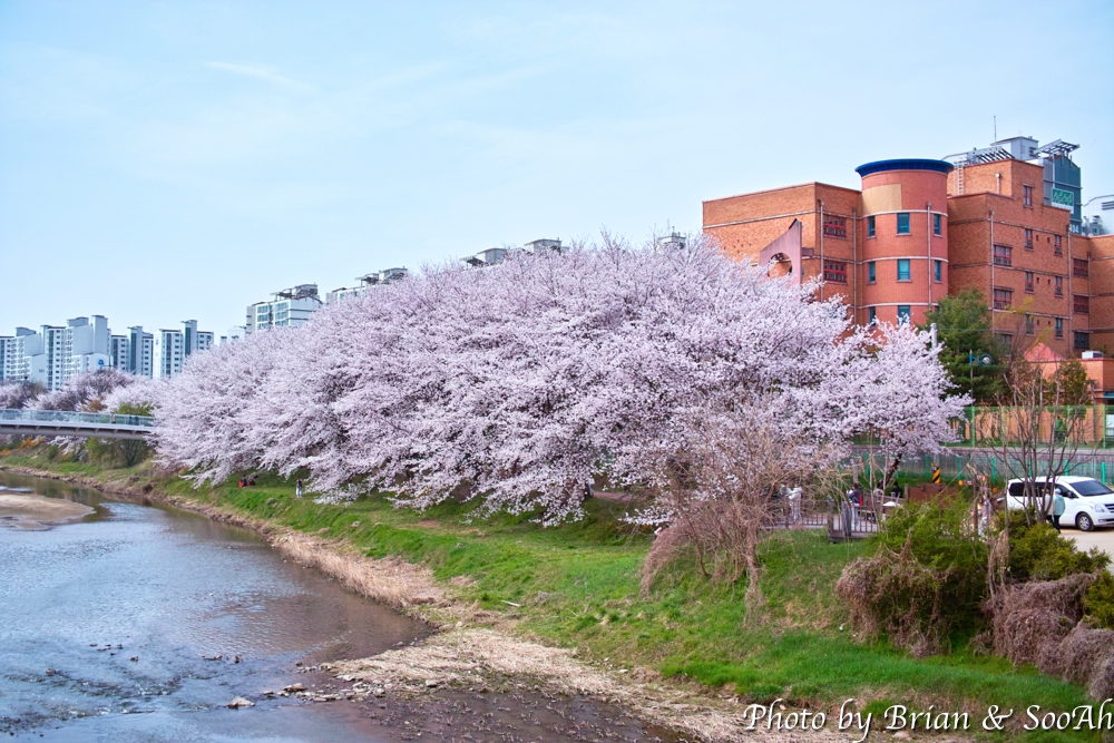 이전 글까지는 예년에도 다녔던 곳이었는데, 올해는 이 황구지천 근처를 추가로 가봤습니다. 작년에 다이어트 및 건강을 위해 수원8색길을 걸을 때 처음 와 봤던 황구지천 천변길이었는데... 사실 팔달구/행궁/수원역까지만 주로 다니다 보니 수원역 너머 서쪽인 권선구 쪽이나 호매실 쪽은 개인적으로는 같은 수원이라고 하기엔 좀 멀어보이는 곳이었는데요.. 그것도 그럴 것이 수원공항이 있기도 하고, 약간 농경지 느낌에 최근에 일부 아파트단지가 갑자기 생기기 시작한 동네란 느낌이 들어서 가볼만한 곳이 없다고 생각했는데요... 수원 벚꽃하면 자꾸 '황구지천'이 나오길래 한 번 가 봤더니... 역시 볼만하더군요. 대중교통으로는 오목천역에서 내려서 찾아가거나, 차로 오시면 근처 체육공원 주차장에 차를 두고 걸어오시면 되는데요. 걸어오면서 다리에서 내려다 보는 천변 벚꽃부터가 일단 장관이더군요.