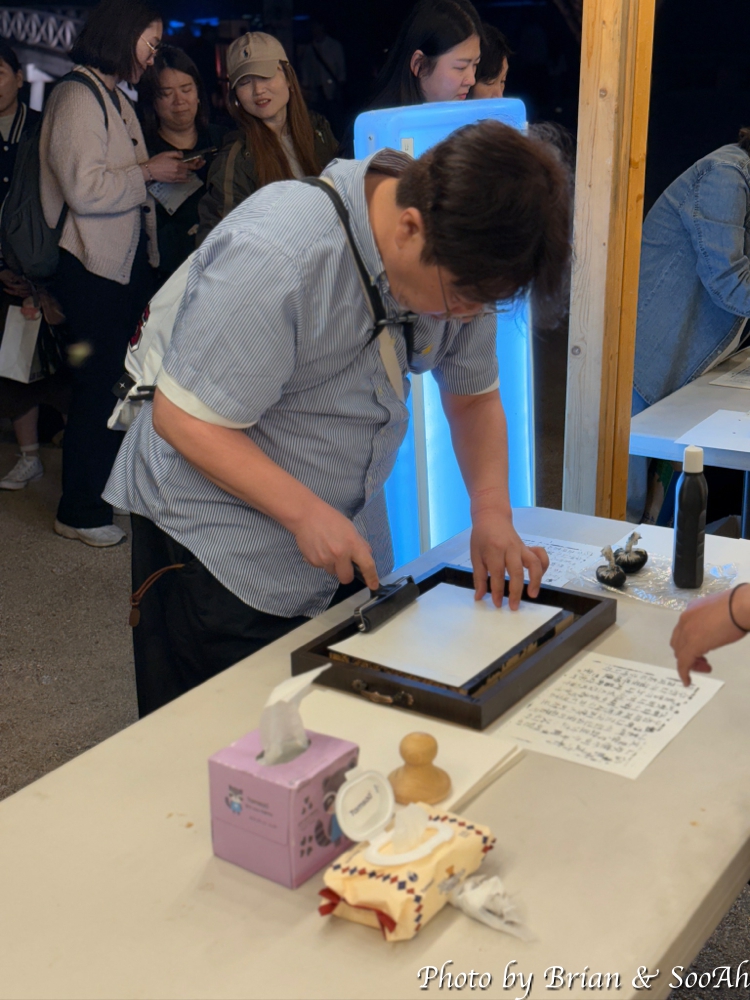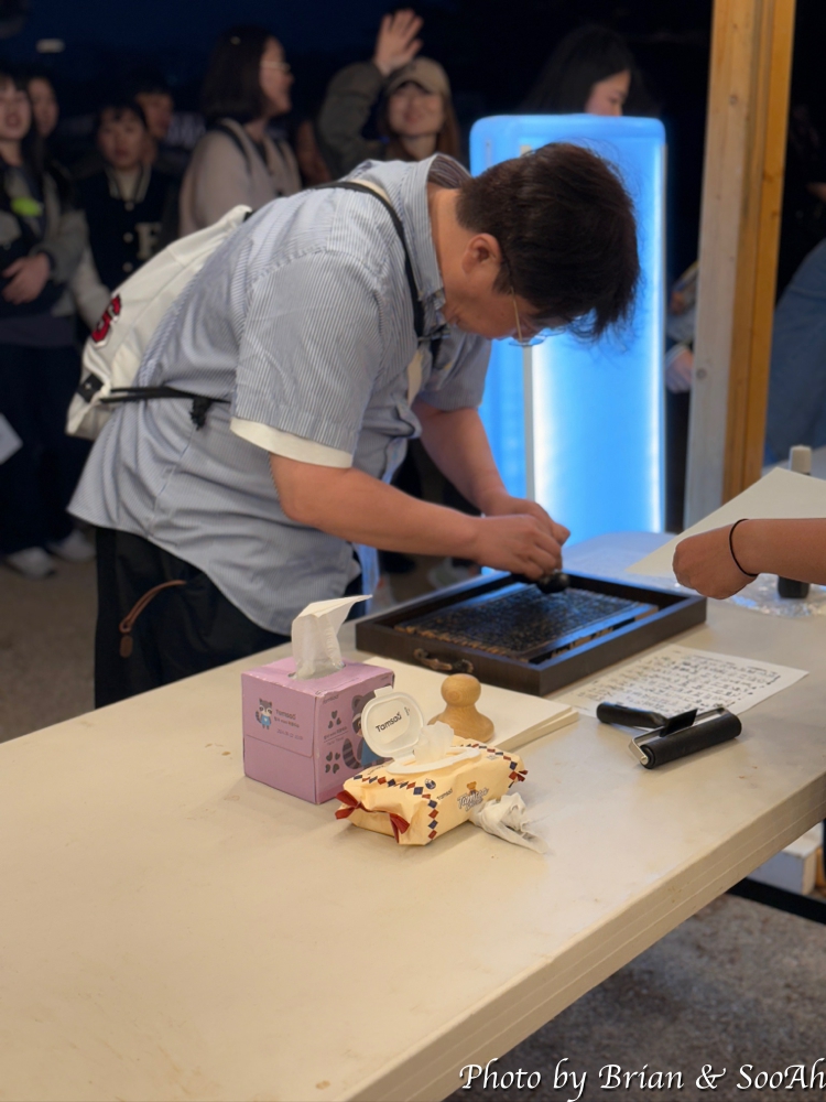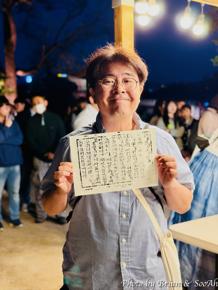 그리고 건천궁 안에는 LED 조형물이 있었고, 그 앞에는 훈민정음이 새겨진 목판(?)을 잉크를 묻힌 후에 종이를 덮어서 판화본을 만드는 체험이 있었습니다. 뭐든 해보고 가겠다는 마음에 하나 해봤었는데, 일부 활자가 제대로 안 찍혀서 나온....