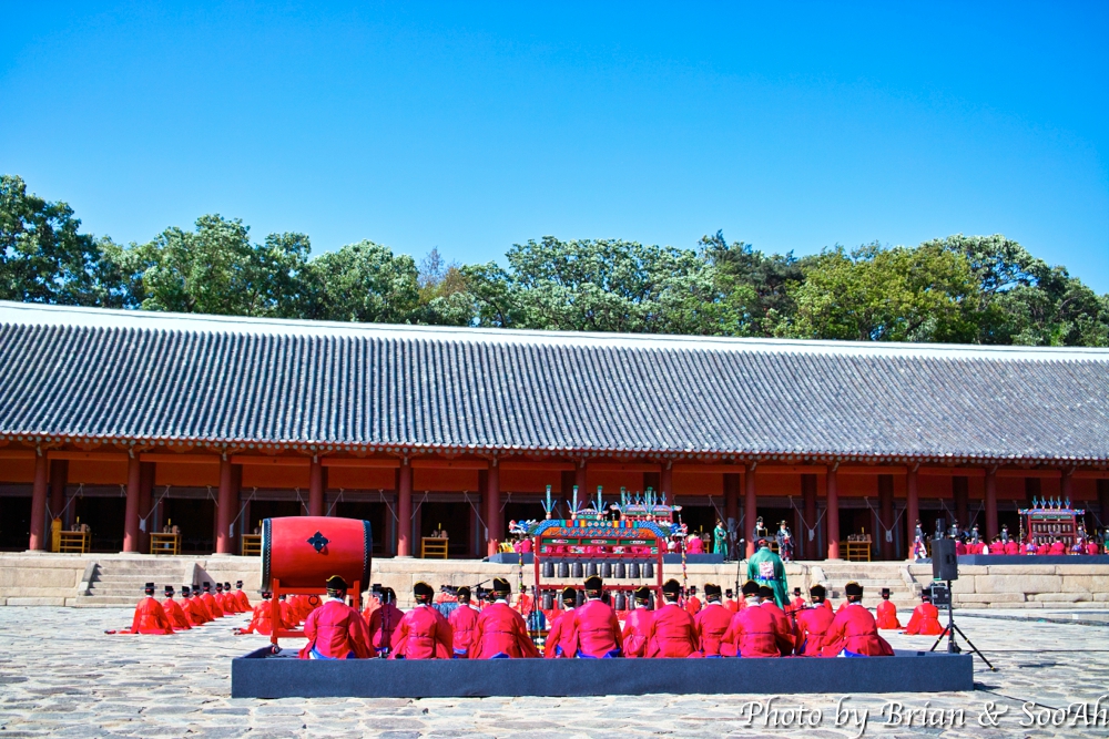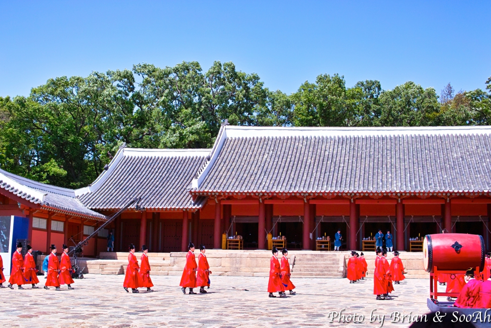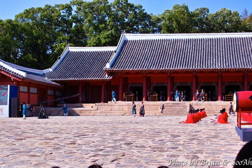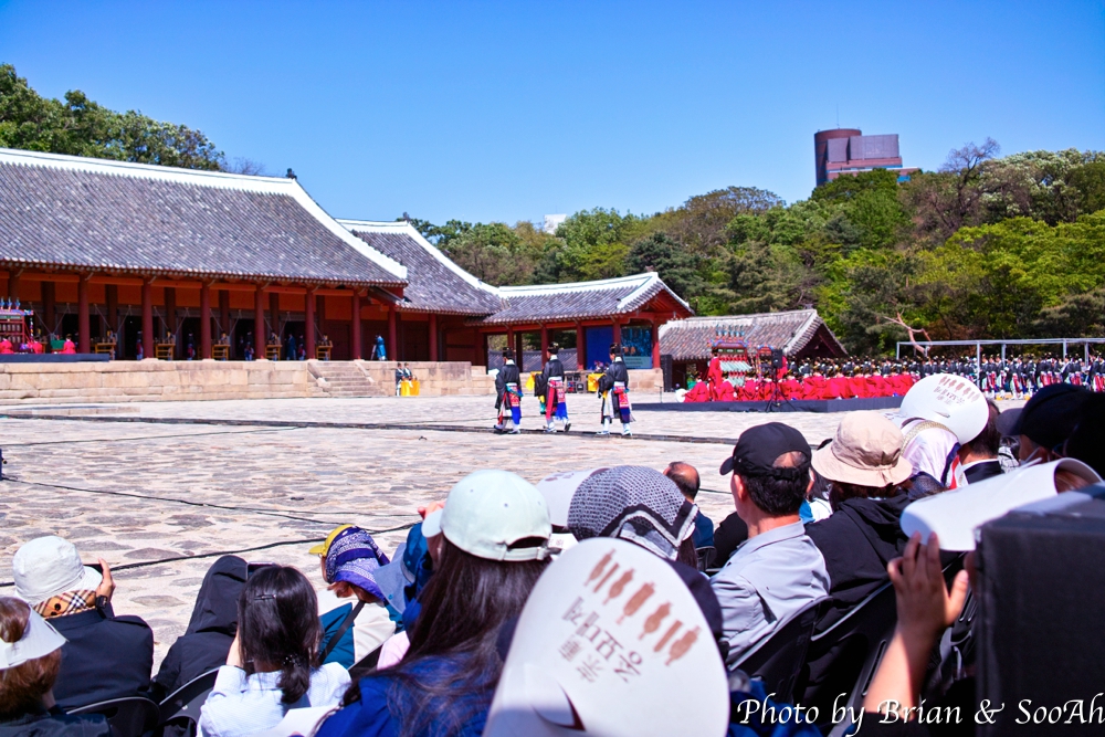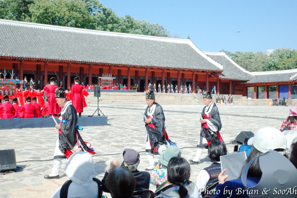 행사 시작 시간인 2시가 되기 1~20분 전부터 제관들이 자리를 찾아 가는 취위(就位)가 진행되었습니다. 다들 자리를 잡고 악공(궁가와 등가)들과 일무를 추는 무용수들도 다 자리를 잡고 나니 요즘말로 하면 개막을 선언하는 진천행사(進請行事)가 시작되면 집례(執禮)가 이후 진행되어야 할 예식/연주/일무를 알려주면 제관/악공/무용수들이 수행을 하는 식으로 진행이 되었습니다.