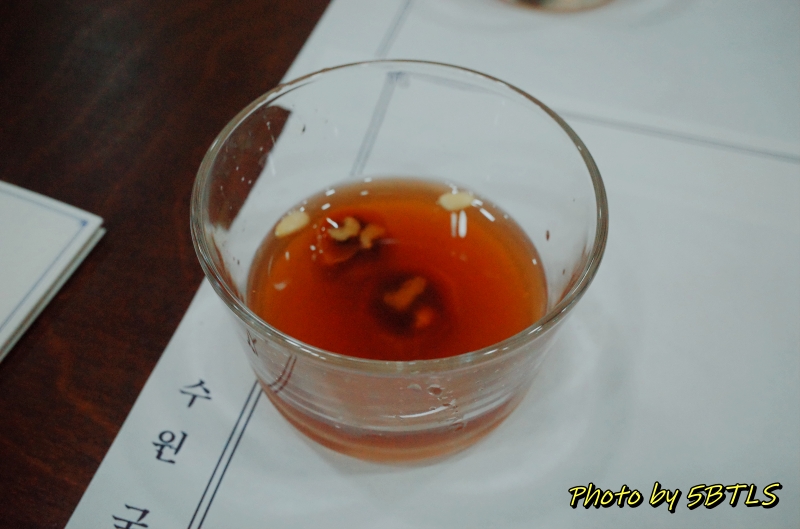 도착하자마자 자리에 안내 받은 뒤에... 참가자 분들이 다 도착하니 가장 먼저 전채 음식이 제공되었습니다. 부각과 율무차였는데, 맛있게 잘 먹고 나니, 바로 수라상이 올라왔습니다.
