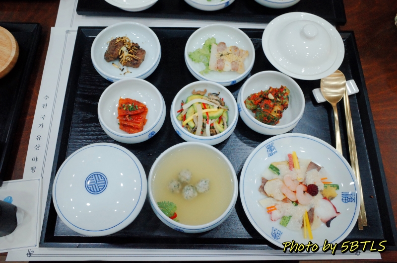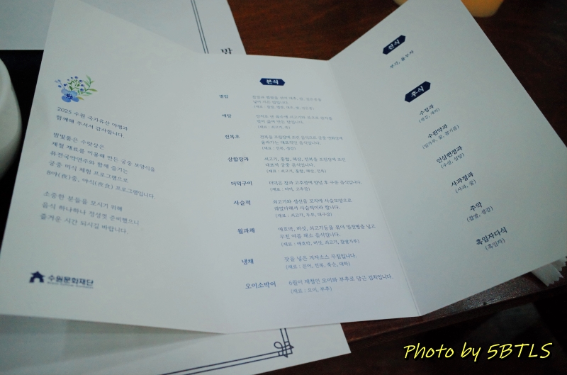 예약을 했던 행사는 수원전통문화관의 식생활체험관에서 진행되는 '밤빛품은 수라상'이라는 행사였습니다. 23년 화성문화제 때 '정조의 식탁'이라는 이름으로 같은 장소에서 야외에서 진행된 행사가 있었는데, 기본적으로 행사 구성은 동일했습니다. 전채 음식과 수라상 그리고 후식까지 구성된 전통 한식 코스를 먹으면서, 국악이 연주되는 걸 들으면서 진행하는 것이었는데, 당시에는 축제 기간이라 재연 배우 분들이 상황극을 하는 내용이었는데, 이번 행사는 비로 인해서 실내로 장소가 옮겨져서인지 아니면 행사 규모가 달라서인지 사회자 분과 음식을 준비해주신 '무형유산 기능 보유자' 분께서 설명해주시는 걸로 간단히 진행되었습니다.